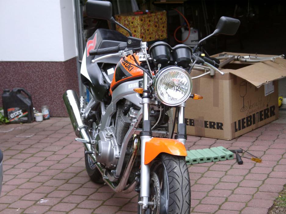 An der Heckverkleidung oder am Tank musst du unbedingt was machen...sieht aus wie ein notdürftig reparierter Unfallschaden. Warum hast du Rahmen und Tauchrohre nicht auch lackiert? So hast du 2 Silbertöne die sich für immer beißen werden. |