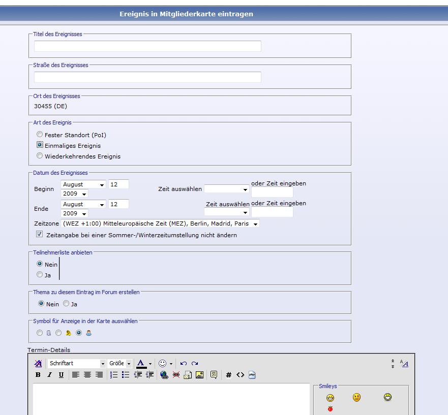 auf der neuen Mitgliederkarte könnt Ihr gute Mopped Termine eintragen. Zu diesen wird dann automatisch ein thread im Treffen/Termine Bereich erstellt und es wird ein Eintrag im Kalender gemacht Dazu geht ihr einfach wie folgt vor: 1. Auf die Mitgliederkarte klicken 2. Die PLZ des Treffpunkts eingeben und im automatisch erscheinenden Auswahlfeld den Ort auswählen und dann auf "Eintrag speichern" klicken. Anhang 5280 3. Alle Felder ausfüllen ( Titel & Strasse ). Als Art des Ereignisses "Einmaliges Ereignis" auswählen und den Haken bei "Thema zu diesem Eintrag im Forum erstellen" markieren. Anhang 5281 4. Einen möglichst aussagekräftigen Beschreibungstext eingeben und auf Ereignis speichern klicken Bei Fragen & Unklarheiten einfach nachfragen. gruss Marcel |