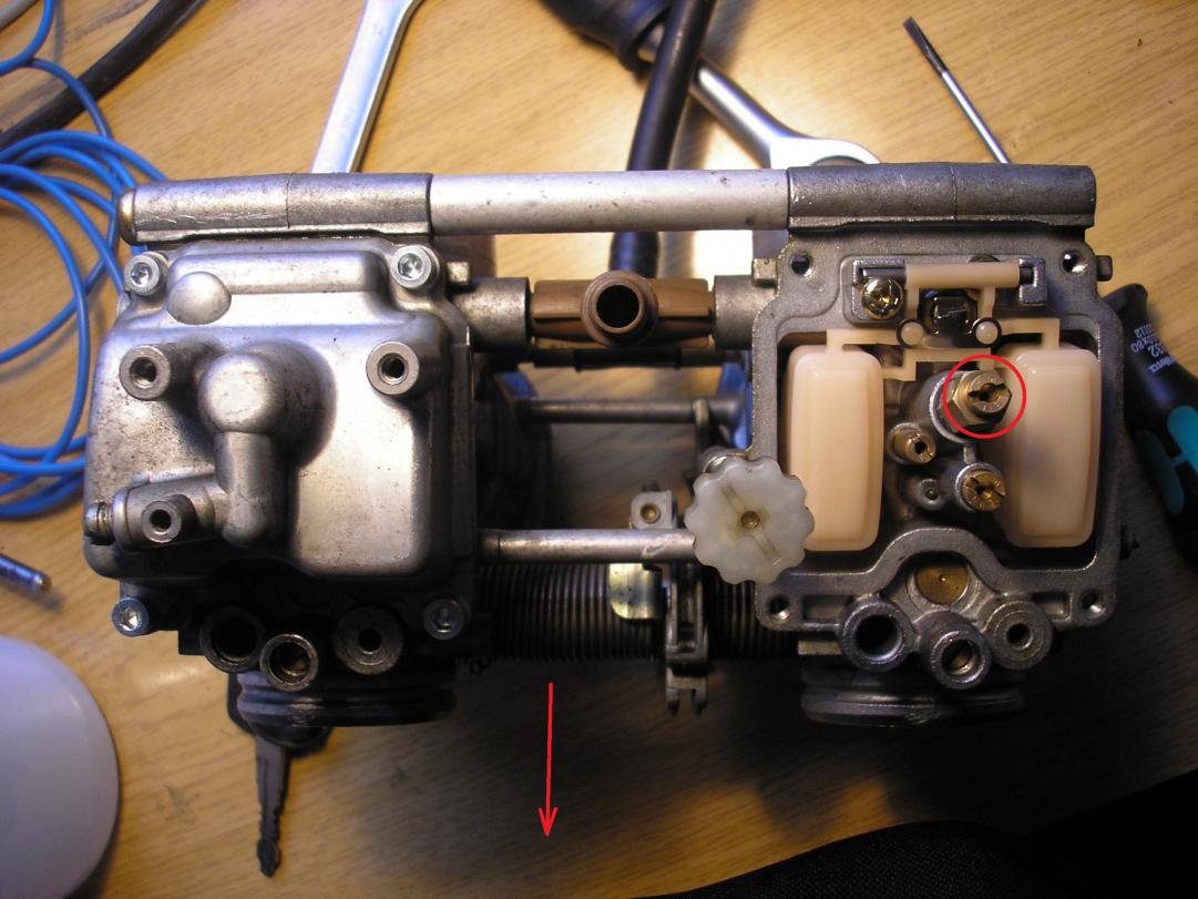 Der rote Pfeil zeigt in Fahrtrichtung. Der rote Kreis ist die Hauptdüse.