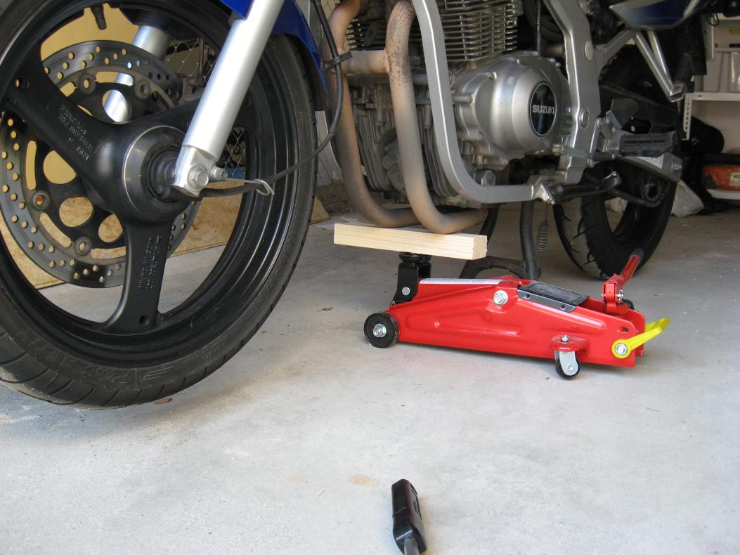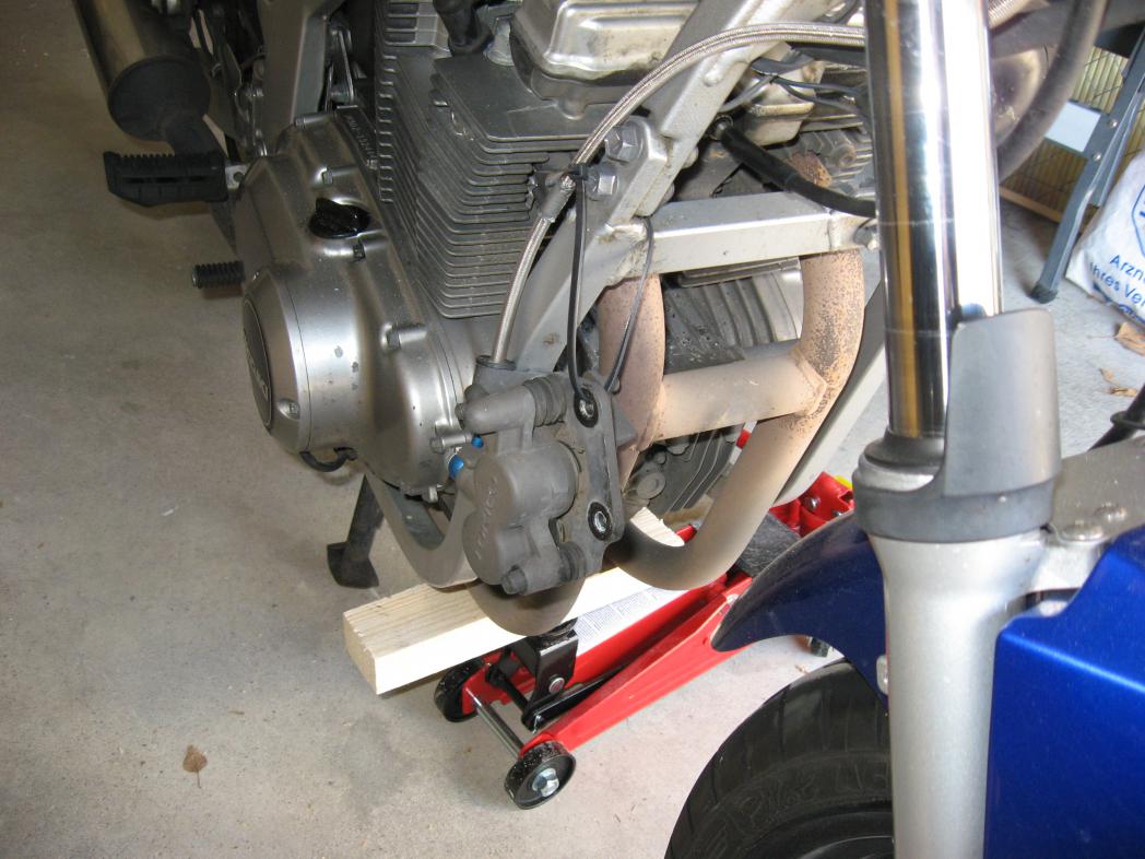 - Jetzt das Vorderrad entlasten, dies geht am einfachsten mit einem Holzstück und einem Wagenheber unter dem Krümmer.