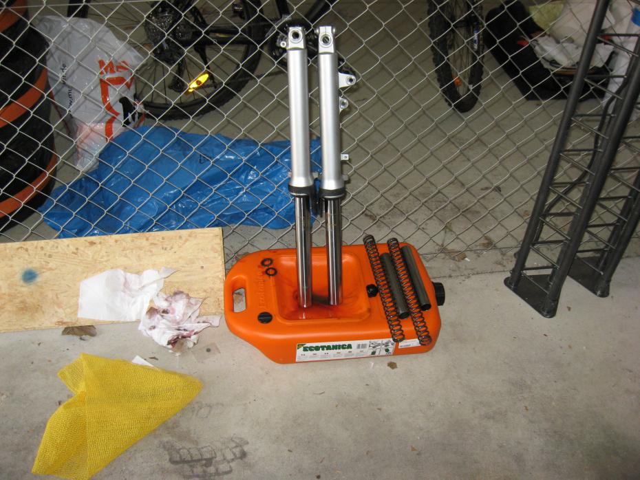 - Öl auskippen, Gabelfedern, Distanzrohr und Zwischenscheibe heraus holen.