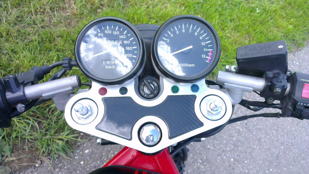 Der Rahmen sieht Stark aus. Glänzendes Rot :rock2: .... und schicke Tacho-Armaturen haste da. Selbst gedrehte Gehäuse?