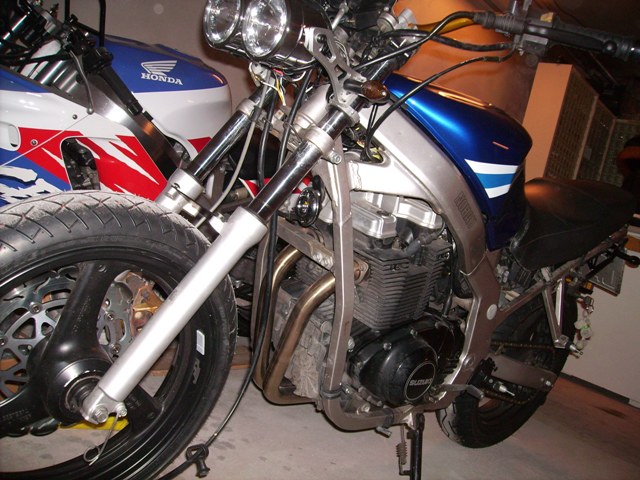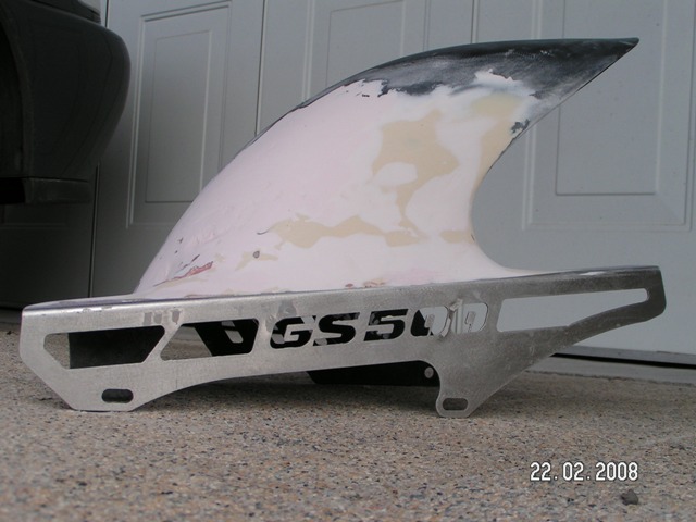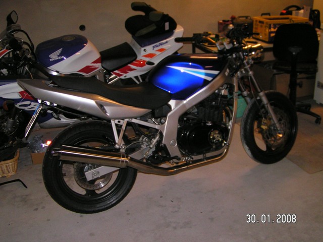 So Leute ich will jetzt auch endlich mal mein Gebastel niederschreiben… Ich hab meine GS die letzten 1 ½ Jahre so gefahren. Baujahr 1993 34 PS Zur Zeit ca. 23.000 tKm Originalzustand bis auf Blinker und Spiegel…. So nun zu meinen Vorhaben die Teilweise auch schon erledigt sind: Erst einmal alles was schon erledigt wurde: - Stahlflexleitungen vorne und hinten - entdrosseln - Lucas BS Alien Disk vorne und Lucas BS hinten - neue Bremsbeläge vorne und hinten - eine BSM Future Auspuffanlage - LSL SB-Lenker - LSL Rasten vorne und hinten in schwarz - Lenkerendenblinker - Edelstahl Fersenschützer mit GS Logo ausgelasert - Doppelscheinwerfer vorne - Kabelbaum untern Tank verlegen - Louis LED Rücklicht - Louis Blinker - Spritzschutz gekürzt - Kennzeichenhalter - 15er Ritzel und gleich neue Kette - Bremsen vorne und hinten mit Bremssattellack in Gold lackiert - KOSO RX1N - Tank von Modell ab 2001 - Verkleidung hinten ab Modell 2001 - Sitzbank ab Modell 2001 (hab ich umsonst bekommen von nem Bekannten) - Bugspoiler angepasst ( da BSM Anlage bisschen anderst liegt als die Orginale) - GSF 400 Hinterradabdeckung mit meinem Edelstahl GS 500 Logo Kettenschutz verbinden - Fender vorne - Ölwechsel - Löcher vom Haltegriff in der Heckverkleidung zulaminieren und ans Rücklicht angleichen [/color] Gerade in Arbeit: Dann kommen noch die Dinge die noch erledigt werden: - Alles zum Lacker… Farbe bin ich noch am grübeln - dann alles zusammen bauen und meine Suzuki und GS Aufkleber wieder drauf - und zu guterletzt ab zum TÜV Ich hoffe ich hab nichts vergessen, falls doch schreib ichs noch rein Und das wars dann für diesen Winter, mal schauen was der nächste bringt!