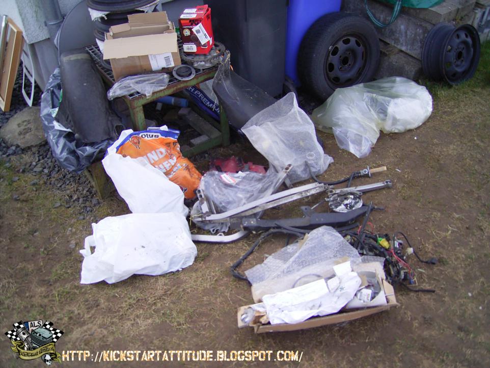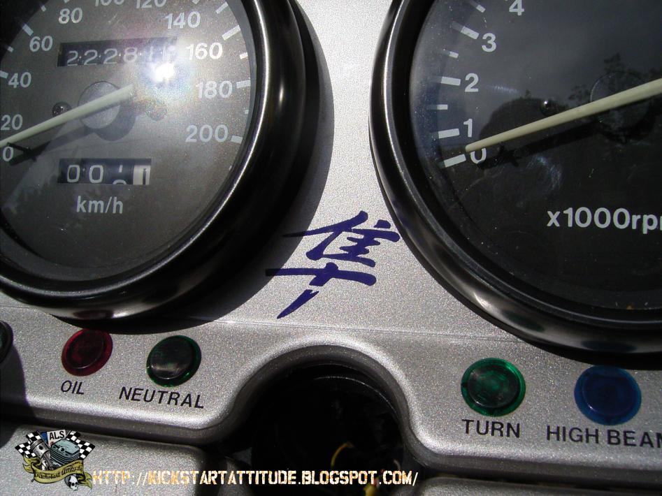 Der Umbau geschieht auf der Basis eines offenen 94er Rahmens, verbaut werden eine Five Stars-Vollverkleidung, ein 170er Hinterreifen und eine Motad-Auspuffanlage, Dynojet Stage, Höherlegung dank Bandit-Federbein um nur mal ein paar Eckdaten zu nennen desweiteren hat mein Vater noch viele Goodies angesammelt (später dazu mehr).