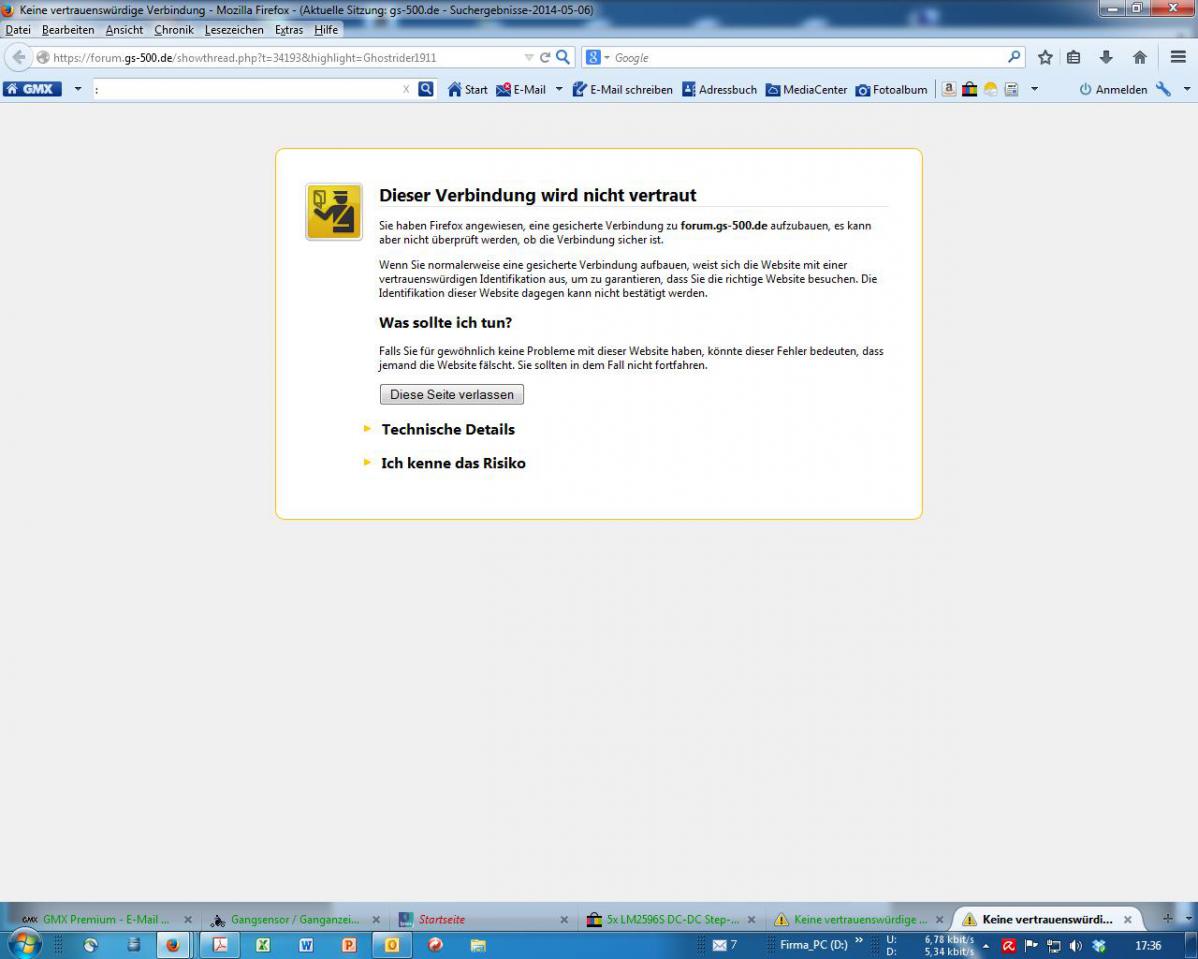 Sie haben Firefox angewiesen, eine gesicherte Verbindung zu forum.gs-500.de aufzubauen, es kann aber nicht überprüft werden, ob die Verbindung sicher ist.