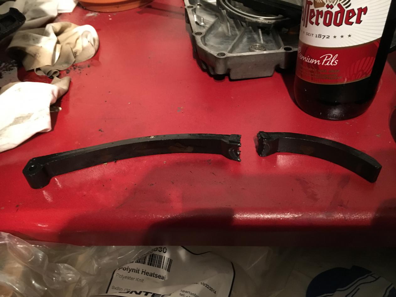 Dann schaute ich in den Motor und bemerkte, dass die Schiene, an die der Spanner drückt, nach oben gerutscht ist und somit der Spanner direkt auf der Kette schliff.