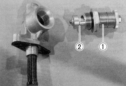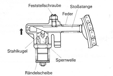 Ja, das muss (sollte) er bei zu hoher Spannung der Steuerkette - allerdings brauchts da schon einiges an Kraft. Dazu war der Spanner früher anders aufgebaut (siehe Bild). Die 2. Feder (Pos1) drückte die Sperrwelle gegen die schiefe Ebene der Spannwelle und verhinderte das Rückdrücken derselben - bis zu einer gewissen Rückdrückkraft - dann wurde die Sperrwelle gegen ihre Federkraft zurückgedrückt. Das konnte man sogar von aussen beobachten. Dummerweise ermüdeten diese Sperrfedern hin und wieder und es der Spanner wurde zu leicht zurückgedrückt, was sich in einem fürchterlichen NW-Schnappen beim Abtouren äusserte. Wir haben dann diese Feder ein paar Umdrehungen weiter vorgespannt und Ruhe war. Spannte man sie aber zu stark vor, dann führte das zum Kettenführungsbruch.