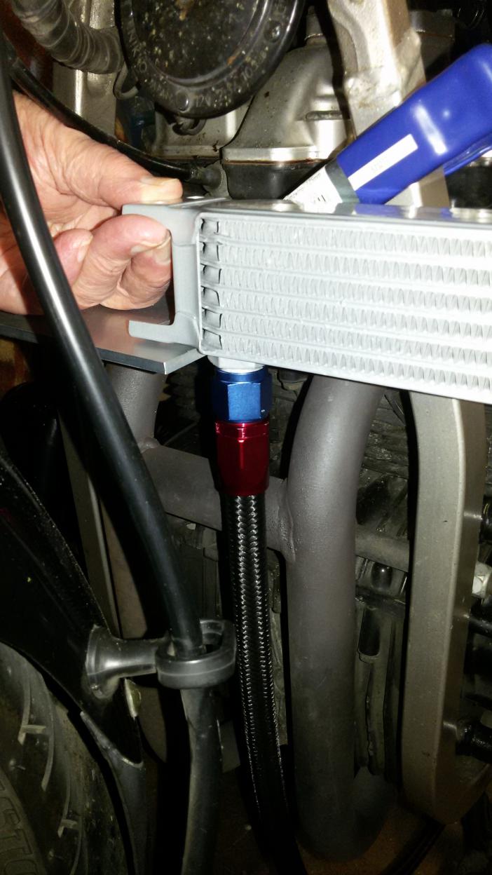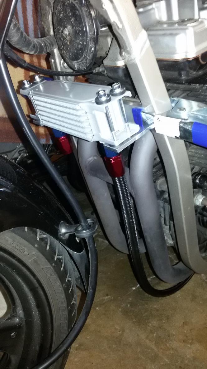 Ich denke, dass durch die große Fläche des Ölfilters und den Kühler genügend Wärme aus dem Motor abgeleitet wird, um die Temperatur jetzt bei 100 Grad zu halten. Auch im Sommer... (ganz genau werden mir das aber erst meine Testfahrten zeigen.)