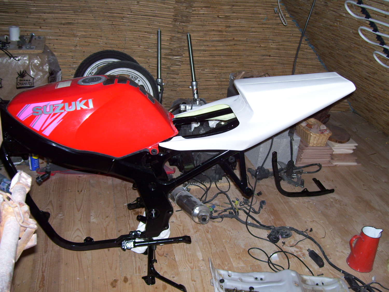 da ich neu bin wollte ich mich und meine gs hier mal kurz vorstellen. Habe sie mir zu meinem 18ten gekauft und fahre sie jetzt seit ca 3 jahren. das forum entdeckte ich letztes jahr im winter und bin dann direkt auf die umbaukategorie gestoßen (sehr geniale sache)... kurz vor ende der sesson wurde mir die vorfahrt von einem autofahrer genommen.. irgendwie war die gs dem auto ein „bisschen“ unterlegen. Bei ihm nur ein paar dellen bei mir ein wirtschaftlicher totalschaden. Meinte zumindest die versicherung...für das geld habe ich sie dann umgebaut und wieder hergerichtet also hier meine umbaustorie: im winter wurde der motor ausgebaut und die 2 brocken unters dach getragen anschließend habe ich sie komplett zerlegt, gereinigt, geschmiert und umgebaut ... was geändert wurde bis jetzt war: rahmenfarbe in schwarz hochglanz (pulverbeschichtet) hinterradschwinge in schwarz hochglanz (pulverbeschichtet) farbe für die federgabeln in schwarz hochglanz (2k eigenlackiereung sämtliche cockpitteile in schwarz hochglanz (2k) neue heck aus gfk einer yamaha r1 (eingetragen) soziussitzaufhängung (selbstgebaut, hat mir der tüv zu meiner eigenden verwunderung eingetragen) 2 neue sitze (vordersitz ist aus dem alten sitzt entstanden) aufhängungsteile für den fahrersitz (alles selbstgebastelt bremsscheibe vorne sportauspuff (laser deeptone) led rücklicht kettenschutz numernschildbefestigung und beleuchtung lenkkopflager schwingenlager vorderradfelge in schwarz hochglanz (bilder hierzu kommen noch, hab gerade keinen foto) hinterradfelge in schwarz hochglanz kleinteile wie scheinwerfer in schwarz hochglanz was noch kommen soll: tank und heck bekommen eine neue farbe bin mir aber noch nicht sicher welche, irgendwas zwischen neon grün,schwarz, wieder rot oder jägermeisterorange, wenn jemand ne idee hat immer her damit ... evtl. vollverkleidung... sou und hier mal ein paar bilder ... sind leider nicht mehr ganz aktuell ... werd aber bald noch ein paar hochladen mit lackierter vorderradfelge und kettenschutz gruß jan |