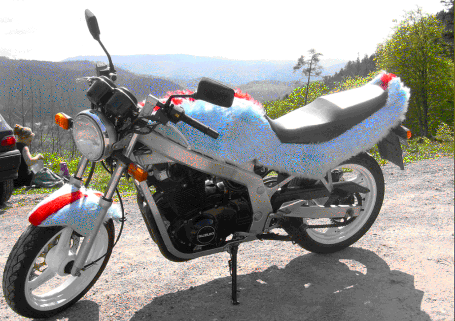 Ich hab mich gestern mit einem über ne Lackierung für die GS unterhalten weil mein LILA- Lack total kaput is und der hat mir von Motorrädern mit Fell erzählt. Ich kenn das zwar aber hab mir noch nie so richtig überlegt das an meiner zu machen. Aber um so länger ich mir das überlege um so schärfer find ichs... Hat sowas schonmal jemand von euch gebastelt oder irgendwie Erfahrungen gemacht??? Habt ihr vllt Bilder wie das an der GS aussieht???