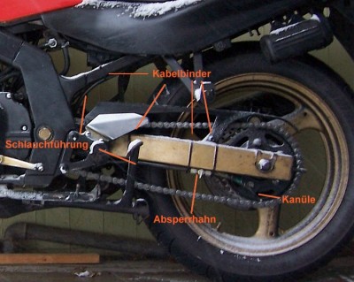 ich hab den "Öler" (Schlauch und Kanüle) hinter dem Absperrhahn mit Draht umwickelt , um die Tropf-Spitze dauerhaft am Kettenblatt anlegen zu können