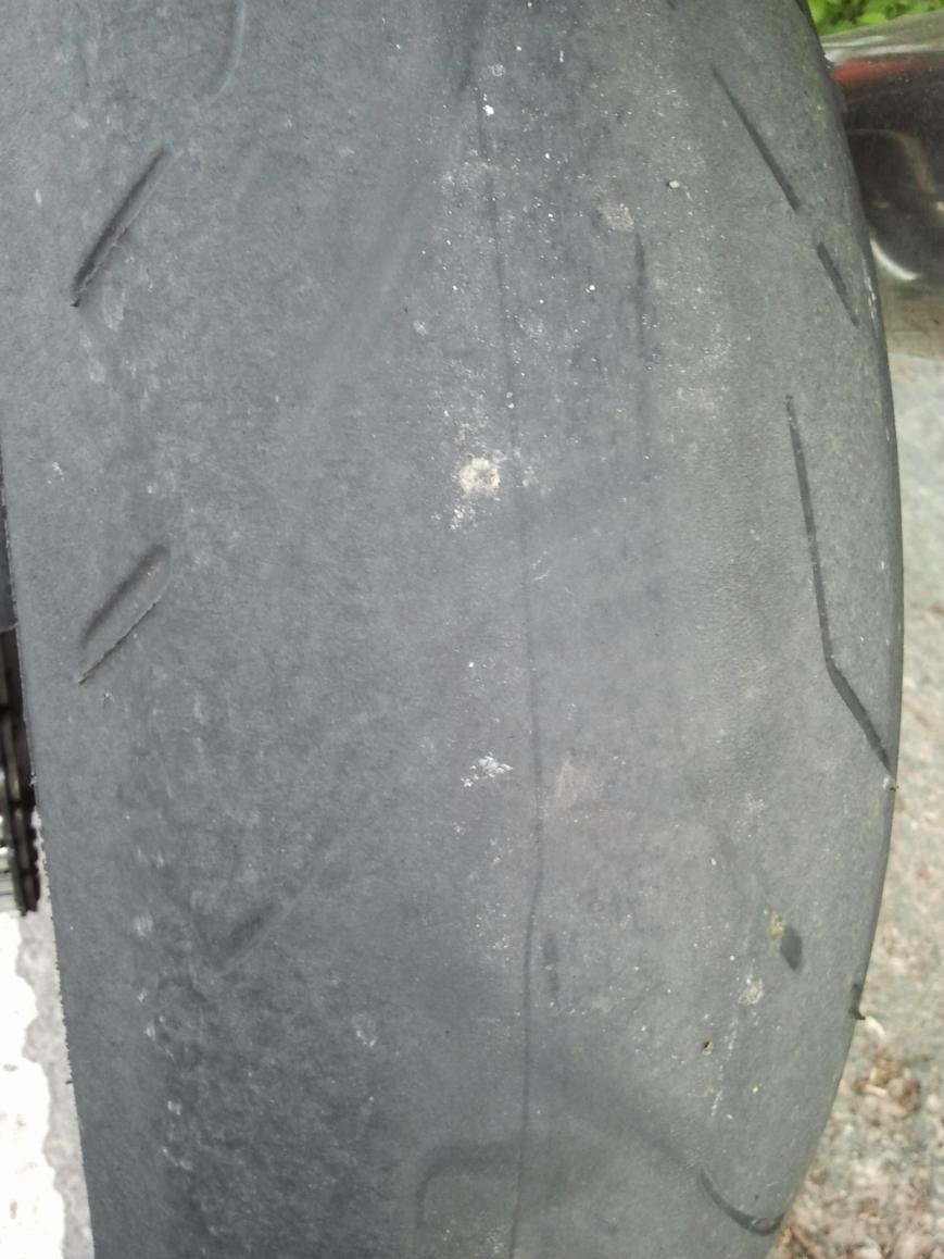 Da fehlt kein Profil. Der Reifen wurde nur so heiß gefahren, dass es das Profil zugeschmolzen hat (sieht man doch)!