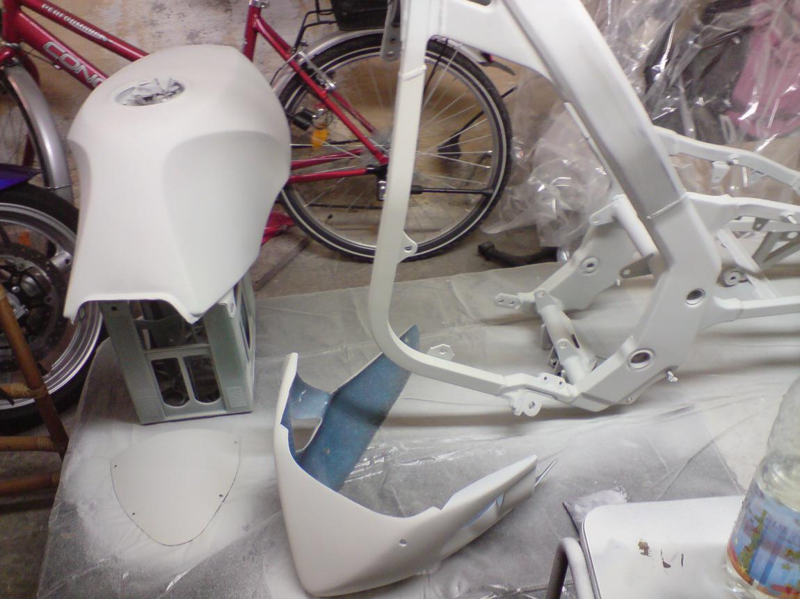 also ich hab damals nur die ganze vorarbeit geleistet. Erst mit groben Papier alles anschleifen, dann Füller drauf lackieren, dann mit feinen papier alles nochmals schleifen (immer nass geschliffen), dann alles weiss bzw schwarz lackieren (danke an meinen dad aber dafür war das ergebniss hammer geil allerdings kommt jetzt zu dem weiss noch dunkelrot |