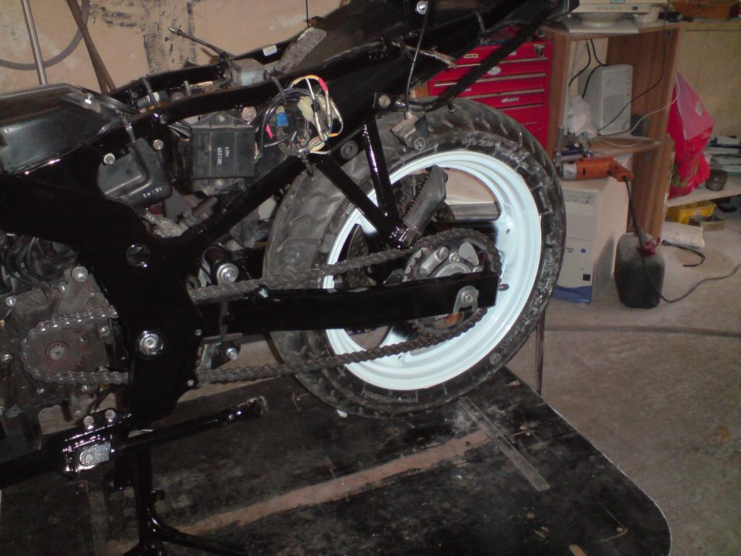 Mein Dad hat alles (Lacksatz, Räder, Rahmen etc) lackiert. Alle Teile sind Metallic Weiss, Rahmen Hochglanz Schwarz...