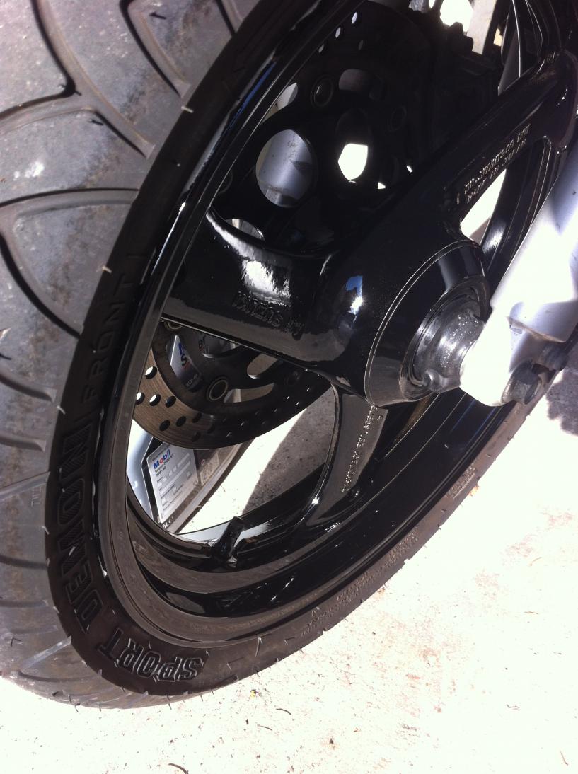 Vorn muss ich zugeben habe ich mir die arbeit gar nciht gemacht. Der originale Lack der drauf war ist so grob das ich das anschleifen gelassen habe. Dann mit der kleinen Airbrush vom Modellbau vorsichtig lackiert bei drehendem Rad. Das Ergebnis wurde besser als hinten.