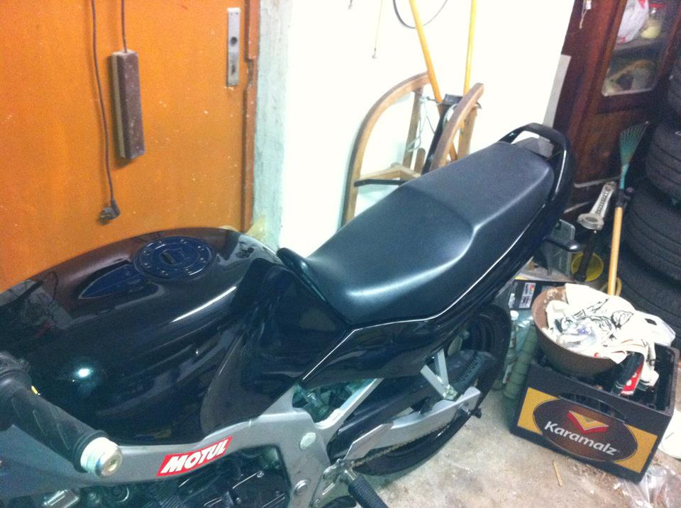 Ansonsten, Tank mit dem Föhn den Suzuki Aufkleber runter dann nass angeschliffen. Verkleidungsteile mit 80er geschliffen da die Aufkleber nichtma mit dem Föhn weichen wollten. Also grad mit weggeschliffen. Danach gespachtelt glatt geschliffen und drüber gelackt. Da es alles im Winter war und meine Wohnung gerade im Umbau war habe ich alles drinnen lackiert und dann vor den Ofen gelegt zum trocknen. Man kann sagen es war eine arbeit von einem Wochenende mit schleifen spachteln und lackiern.