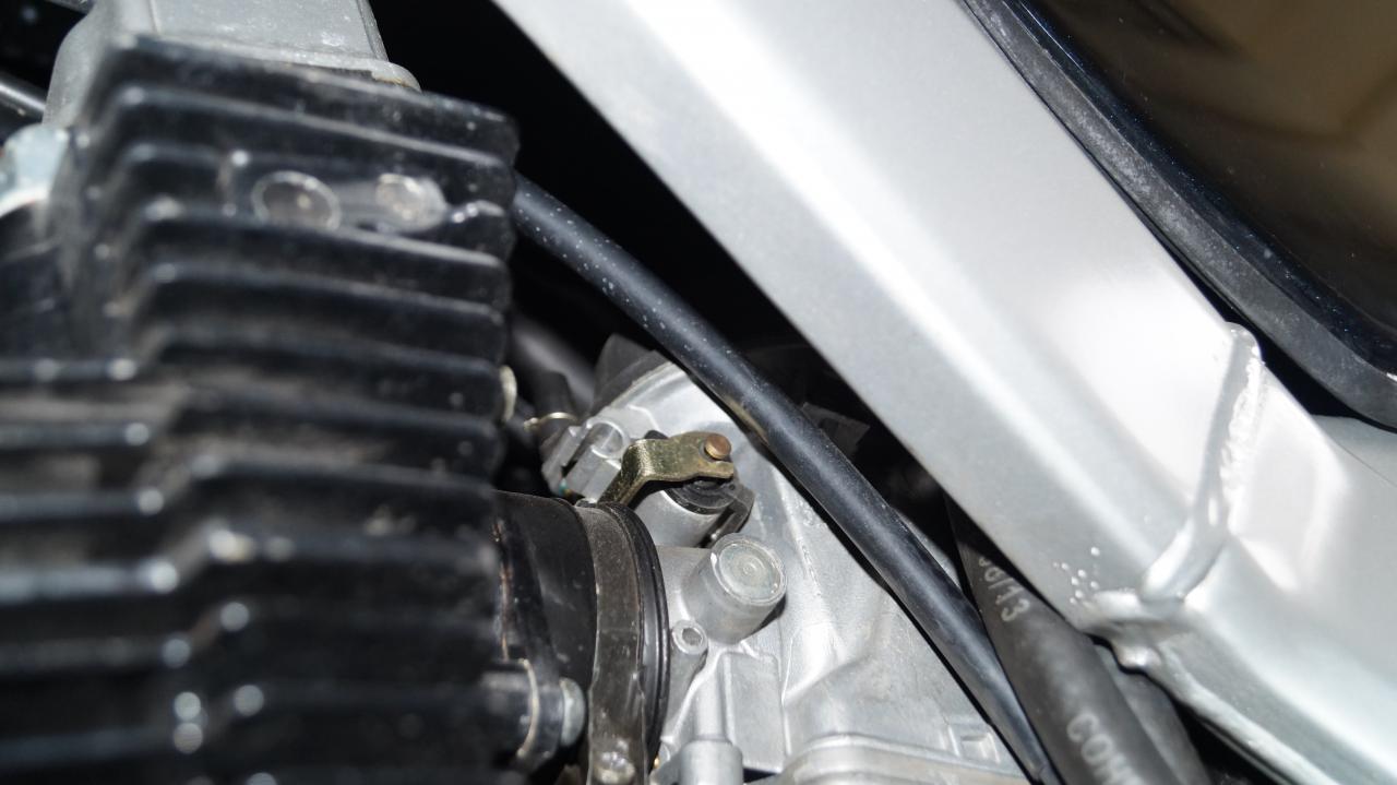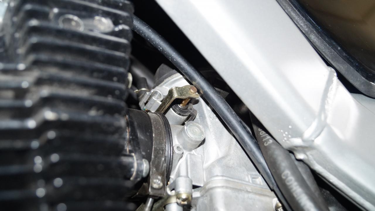 Wenn du von in Fahrtrichtung links unten auf den Vergaser schaust, siehst du da die Chokemechanik (gelbverzinkter Schlitten). Wenn du am Chokehebel am Lenker ziehst, sollte sich der bewegen. Choke raus = Mechanik ganz nach rechts, also an den Vergaser gedrückt.