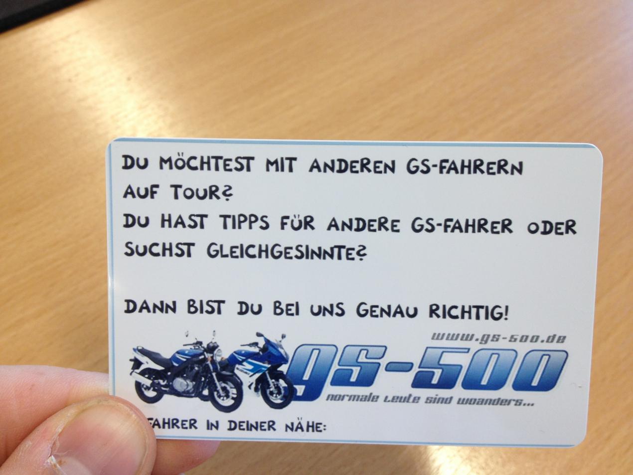 mich hat's gestern mal wieder geärgert, dass ich keinen Zettel zur Hand hatte als ich ne andere GS am Straßenrand stehen sah. Also hab ich mich heute mal hingesetzt und 'ne Visitenkarte für's Forum entworfen. Verbesserungsvorschläge sind erwünscht! ![]() XCF-Datei für Gimp (wer dran rumbasteln will): http://www.loaditup.de/737694-krmw8wgwey.html (edit) PSD-Datei für Photoshop: http://www.loaditup.de/737698-3qsvtg52h6.html PDF-Datei zum Ausdrucken und laminieren: http://www.loaditup.de/737695-25nptt4hu8.html
