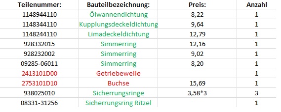 Aber danke für eure Tips! Motor steht jetzt schon fast seit 2 Wochen ausgebaut und unberührt dank Prüfungen auf meiner Werkbank kanns kaum abwarten Habe hier noch eine Liste von Teilen vielleicht weiß ja jemand ob noch was fehlt: