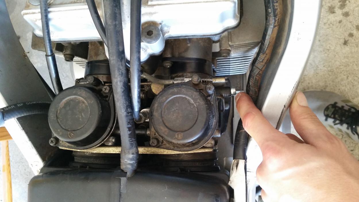 Auf den ersten beiden Bildern ist der rechte Vergaser mit dem Blindstopfen (keine Ahnung wieso der dort ist). Auf dem dritten Bild der linke Vergaser (mit Zettel