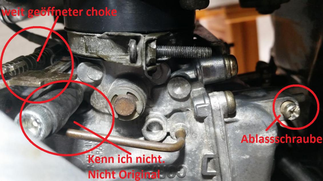 Auf jeden fall ist der Choke auf den Bildern geöffnet... prüf mal, ob da noch spiel in dem Seilzug ist. Im Zweifelsfall ist der zu sehr gespannt und du bekommst daher ein zu fettes Gemisch. Was diesen Komischen Schlauch mit Imbussschraube da angeht... der hat da eig. nix zu suchen... Da hat vor dir schon mal jemand versucht irgend etwas abzudichten. Es sieht auch so aus als wäre an der Vergaserentlüftung kein Schlauch dran aber das kann täuschen. Auf dem Bild vom linken Vergaser hab ich mal die Synchronanschlüsse markiert von denen wir geredet haben.