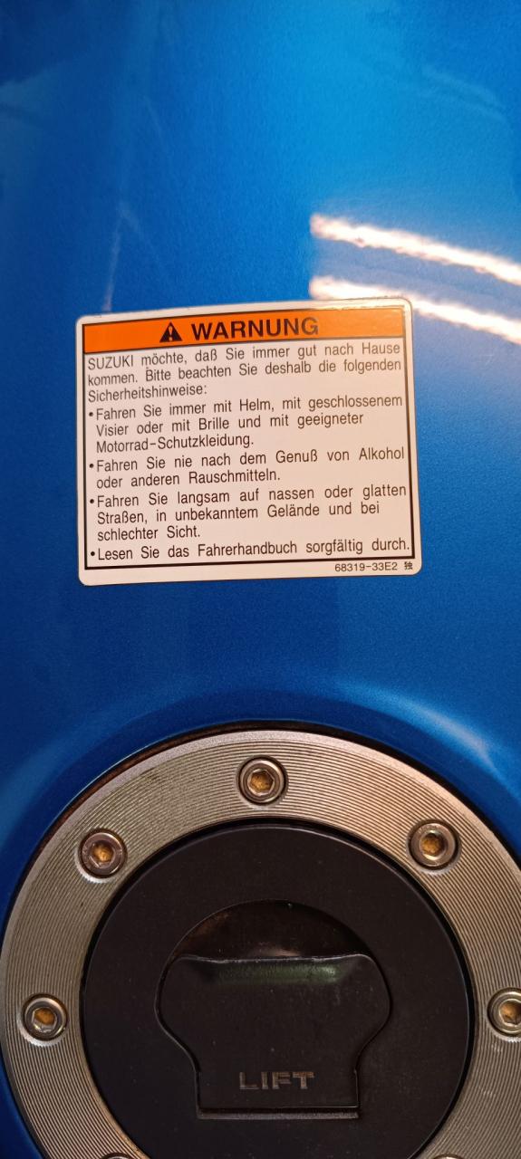 Ich kann einfach nicht glauben, daß Suzuki damals so genau planen konnte, wieviele und welche Motorräder im deutschsprachigen Raum verkauft werden- und daher den Aufkleber bereits im Werk mit überlackiert haben.