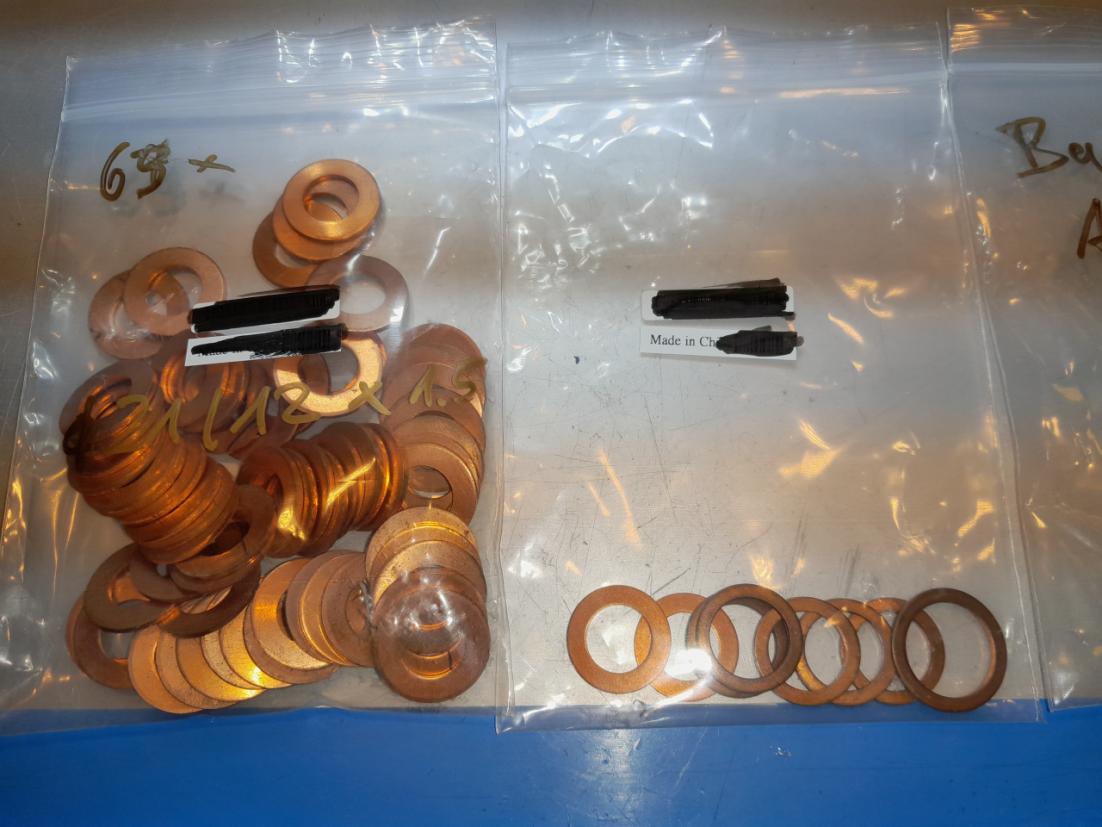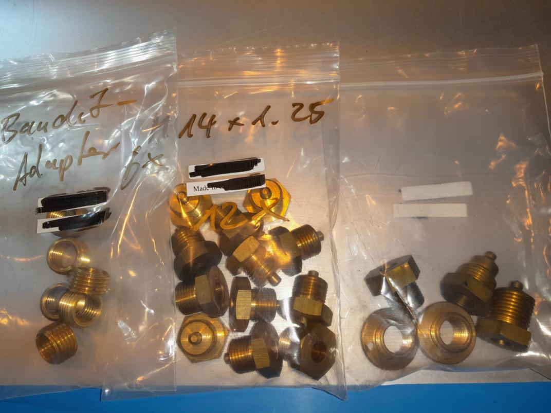 da ich meine Werkstatt etwas aufräumen muß und die Hoffnung habe, daß es hier noch einen Hardcoreelektronikbastler gibt, biete ich die Überreste meiner Öltemperaturmessgerätebasteleien an. Speziell für die GS500 bzw. deren Hauptölkanal gefertigte Leergehäuse (12 Stück) in M14x1.25 zum Einbau eines eigenen Temperaturfühlers. Innen befindet sich eine Stufenbohrung d8x16 und d2.5x3.5 Außerdem 63 Kupferdichtungen da21/di12x1.5, 6 Gewindeadapter M16x1.5 auf M12x1.5 und ein paar sonstige Leergehäuse und Dichtungen (siehe Fotos). Alle diese Teile wurden speziell für mich hergestellt und waren nicht billig. Abzugeben für 25€ inkl. unversichertem Versand per Hermes. Andere Versandwünsche gegen Kostenübernahme. Gruss Harry