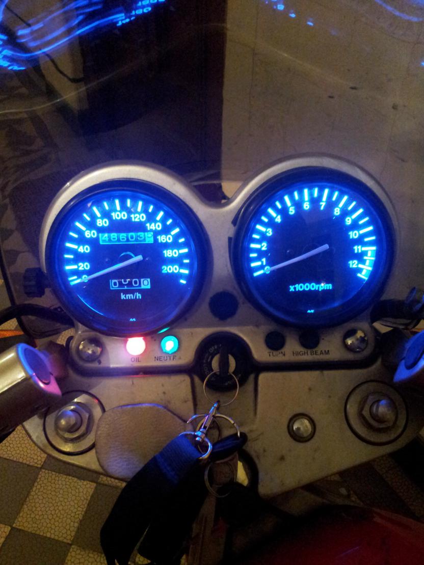 Das gute daran ist: keine Umbauten! Einfach den Tacho soweit auseinander nehmen, bis man die alte Fassung rausziehen kann. Dann die neuen LEDs rein und gut ist. Alles wieder zurückbauen und schön blau leuchtest jetzt Bild. Das Problem ist nur, dass der Vorbesitzer anscheinend mal den Tacho ganz auf hatte und er deshalb von innen angelaufen ist. Muss ihn wohl doch mal aufbördeln... Aber wozu gibt es ne Winter-/Saisonpause?! Man(n) will ja was zu tun haben. Und wenn man gleich dabei bin, lackiere ich die Zeiger auch gleich rot. Dennoch denke ich, dass man mit dem Ergebnis in Sachen Helligkeit zufrieden sein kann. Grüße