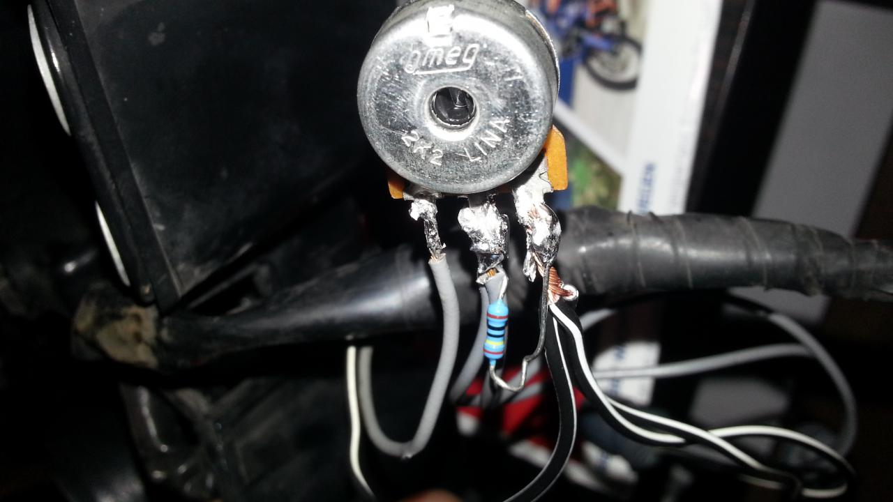 Verwendet hab ich ein 2k2Ω-Potentiometer sowie einen Widerstand (Ich glaube 240Ω, aber ich bin nicht sicher. Naja, man erkennt es ja am Farbcode).