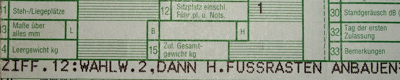 wenn einige prüfer die eintragung einer wechselsitzbank nicht für erforderlich halten ist das schön aber verlassen will ich mich darauf nicht. persönlich habe ich bei verschiedenen prüfern auf nachfrage andere informationen erhalten und auch bei anstehenden eintragungen andere erfahrungen gemacht. es war bisher z.b. so, daß sitzbankeigenkonstruktionen basierend auf metallplatten eintragungsfrei waren, für sitzbänke mit mit gfk-unterkonstruktionen war aber in der regel mindestens ein materialgutachten und damit die eintragung erforderlich. teilweise ging es ohne gutachten aber immer nur mit eintragung. auch ohne werkzeug tauschbare einzelsitzbänke wurden in der vergangenheit immer eingetragen, auch wenn meist nur die anzahl der sitzplätze wahlweise eingetragen wurde, was ich für durchaus plausibel halte. selbst bei auf originalen sitzbänken basierenden umbauten war dies der fall. was auch noch bleibt ist die serienmäßige eintragung bei meinem motorrad (s.o.). aber egal, eine eintragung ist jederzeit möglich und jeder kann selbst entscheiden was er tun möchte, es gibt ja nur zwei möglichkeiten: - man läßt die einzelsitzbank bzw. die geänderte anzahl der sitzplätze eintragen und ist so definitiv legal unterwegs oder - man vertraut darauf, daß es ohne eintragung legal ist oder es niemanden interessieren wird und zieht im ernstfall vielleicht den kürzeren. da meine motorräder noch nie lange serienmäßig aussahenen und es deshalb durch unwissenheit der exikutive schon genug dikussionen gab vertraue ich weiterhin auf die erste möglichkeit. jeder wie er mag!