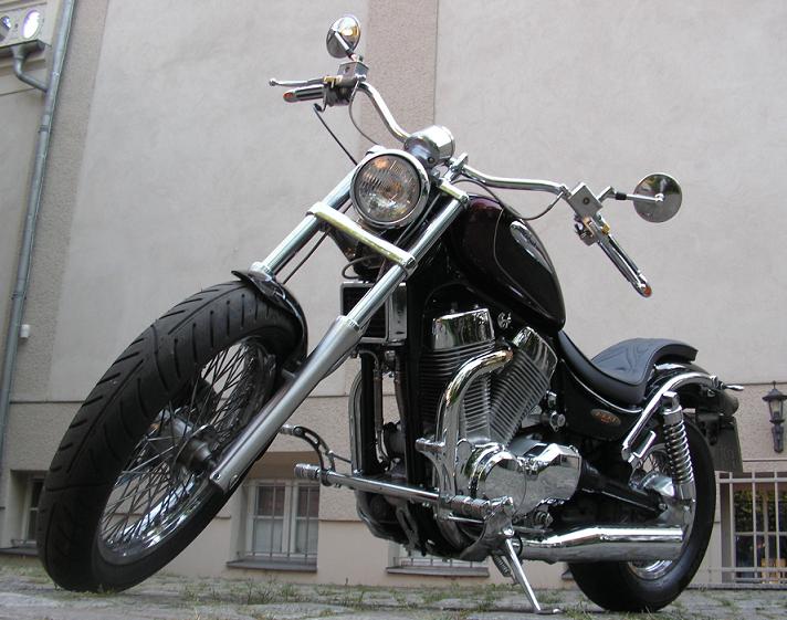Hab lange nichts machen können, weil ich neben allerlei Prüfungen mit dem Umbau einer Suzuki VS1400 Intruder beschäftigt war: So original war sie dem Besitzer kaum zuzutrauen...ein wahnsinnig schmaler mini-Apehanger und Rasten, die vielleicht für nen 12-jährigen bequem vorverlegt erscheinen Auch die Sitze erinnerten eher an Clubsessel als an Motorradgestühl... Also hamwa eine vorverlegte Fußrastenanlage von Falcon, einen LSL Flybarlenker mit entsprechend neuen Stahflexleitungen für Bremse und Kupplung, einen GTS HardriderSitz und rundrum Kellermänner verbaut. Das olle aufgesetzte Suzukirücklicht wurde durch ein kleines ovales LED-Rücklicht unterm Fender ersetzt, wodurch das Kennzeichen gut 6cm höher konnte um die Sicht auf die neue, schick geschnittene und weniger ballonige Pelle freizumachen. Ich würde hinten noch kürzere Federbeine und auf jeden Fall nen andren Auspuff verbauen (die 1400er Trude hat beim Soundcontest gegen meine GS so wahnsinnig abgestunken, dass der Besitzer ganz traurig wurde Naja...jedem seins. Meine Bananenschwinge war derweil beim Fräser um pro Seite 4mm wegzufräsen. Der Fräser sagt: wahnsinnig hartes Alu! Er hat auch fast 2 Stunden dran gesessen (neben dem harten Material ließ sich die Schwinge auch schlech spannen, wegen den ganzen Nähten und Buckeln). Wenn das keiner von Vadderns Fußballkumpelz gewesen wär, wär`s echt teuer geworden...so war`s n Zehner in die Kaffeekasse Wie man sieht, brauche ich noch die passende Umlenkung (so liegen die Knochen an der Schwinge an und die Schwinge steht doch arg hoch). Bis ich die bekomme, kanns leider ein Weilchen dauern so far...