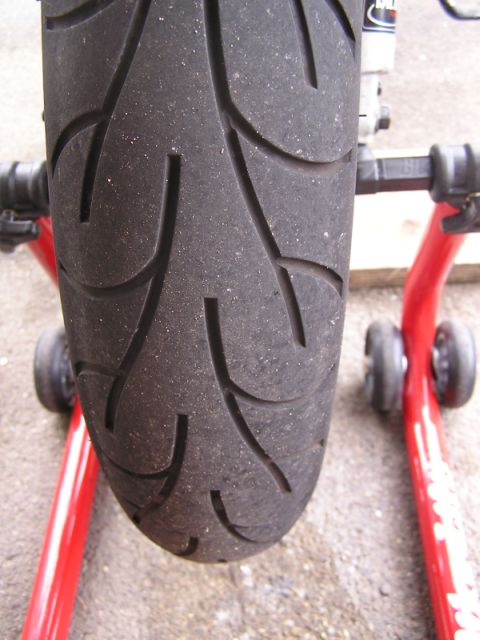 In Real sieht der Hinterreifen sogar noch schlimmer aus. Eigentlich bräuchte ich im Stand den Ständer garnicht mehr ausklappen, so platt ist der in der Mitte. Da dürften meine Bremsübungen ihren guten Teil dazu beigetragen haben....