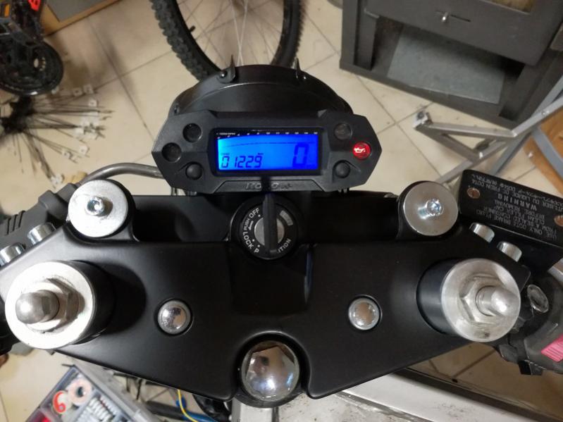 Nicht viel passiert. Habe die Abdeckung der oberen Gabelbrücke schwarz matt lackiert, ebenso die Felge, sah nicht mehr schön aus. Der gesamte Kabelbaum der normalerweise im Scheinwerfer steckt ist jetzt unter dem Tank verstaut. Den Koso habe ich montiert, gefiel mir irgendwie nicht richtig, dann habe ich Distanzhülsen gedreht und den Tacho 20mm tiefer gesetzt. (Bild mit Beleuchtung). Viel besser. Ach ja der Auspuff war mir ein Stück zu lang, der wurde um 80mm gekürzt, sieht dann später wenn er steiler steht nicht so schlimm aus. |