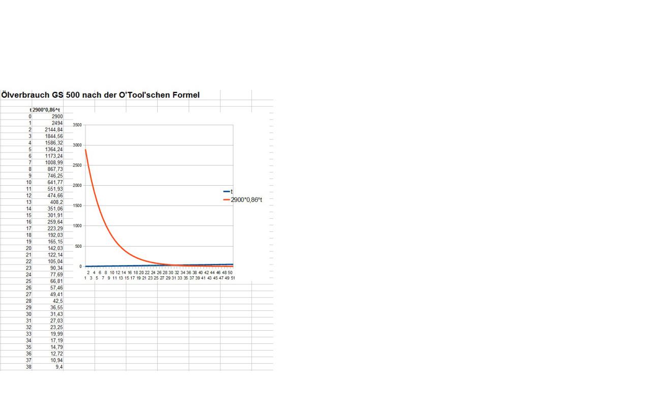 0,4 von 2,9 sind 13,79%. Diesen Prozentsatz habe ich jetzt pro einmal Auffüllen auf die Menge des Öls gerechnet, welches nach dem letzten Auffüllen vom ursprünglichen Bestand übrig bleibt. Man darf nicht vergessen, dass jedes mal auch neues Öl verbraucht wird.