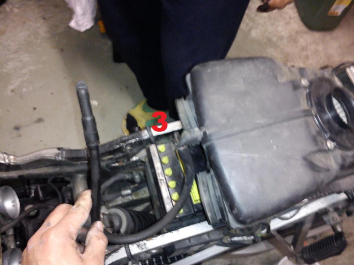Schlauch (2) und Schlauch (3) bin ich nicht mehr sicher. Ich glaube (3) war unten am Luftfilterkasten dran und der zweite??? Er passt weder unten hinten hin, noch oben an den Stecker wo Richtung Vergaser zeigt.