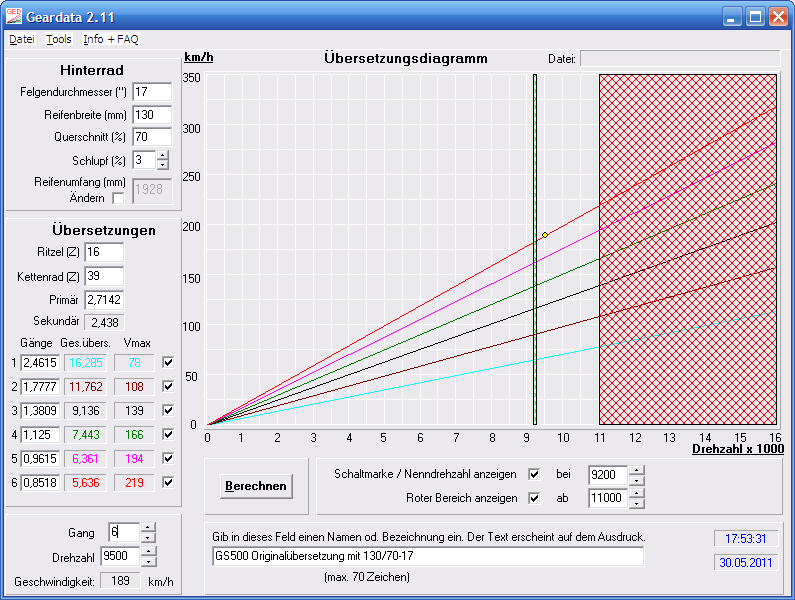 Tschuldigung! Du hast nat. recht! I.wie habe ich mit geardata mal rumgespielt -und da war das die "Voreinstellung! bei mir. Jaja die gs sieht bei 10.500 noch lange nich rot! Aber dass Dein Tacho mit Welle ca. 400 Umdrehungen vor geht musst Du mir mal erklären -kann es sein Du meinst den DZM? Oder rotiert Deine Tachonadel und Du zählst mit??? @majestic_morpheus Stimmt! Du hast auch recht!! Tschuldigung xxl! Ich meinte 9200 nicht 10200! Um mal ein paar Ilustren hinzuzufügen hab ich mal den 6. Gang mit geardata bei 9200, 9500, 9800, 9900, 10.000 und "meinen"(falschen) 10.200 gesnapt: |
