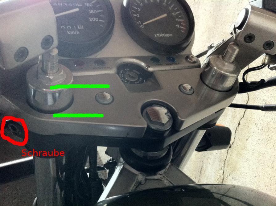 einfach die gabel vorne los schrauben an der oberen und unteren gabekbrücke an der oberen ist die schrauben eingezeichnet, weis aber nicht aus dem stegreif ob da mehr sind, an der unteren ist sie auch noch befestigt. dann die gabel nach unten rausziehen bis die beiden stellen die ich makiert hab bündig sind, schau dir einfach mal fotos von gs'n an hab grad keins zur hand pass auf das die gabel vorne entlastet ist beim rausziehen! |