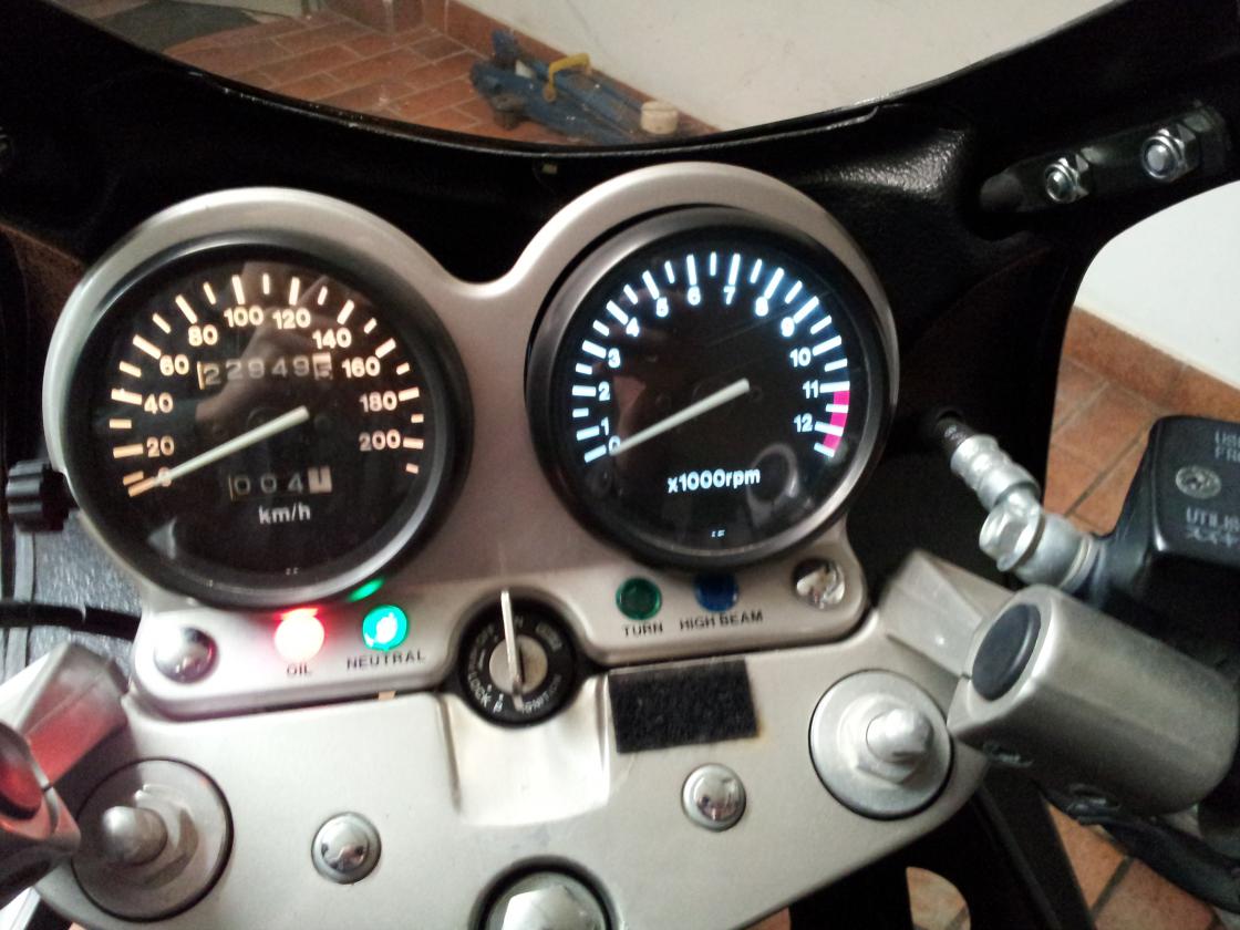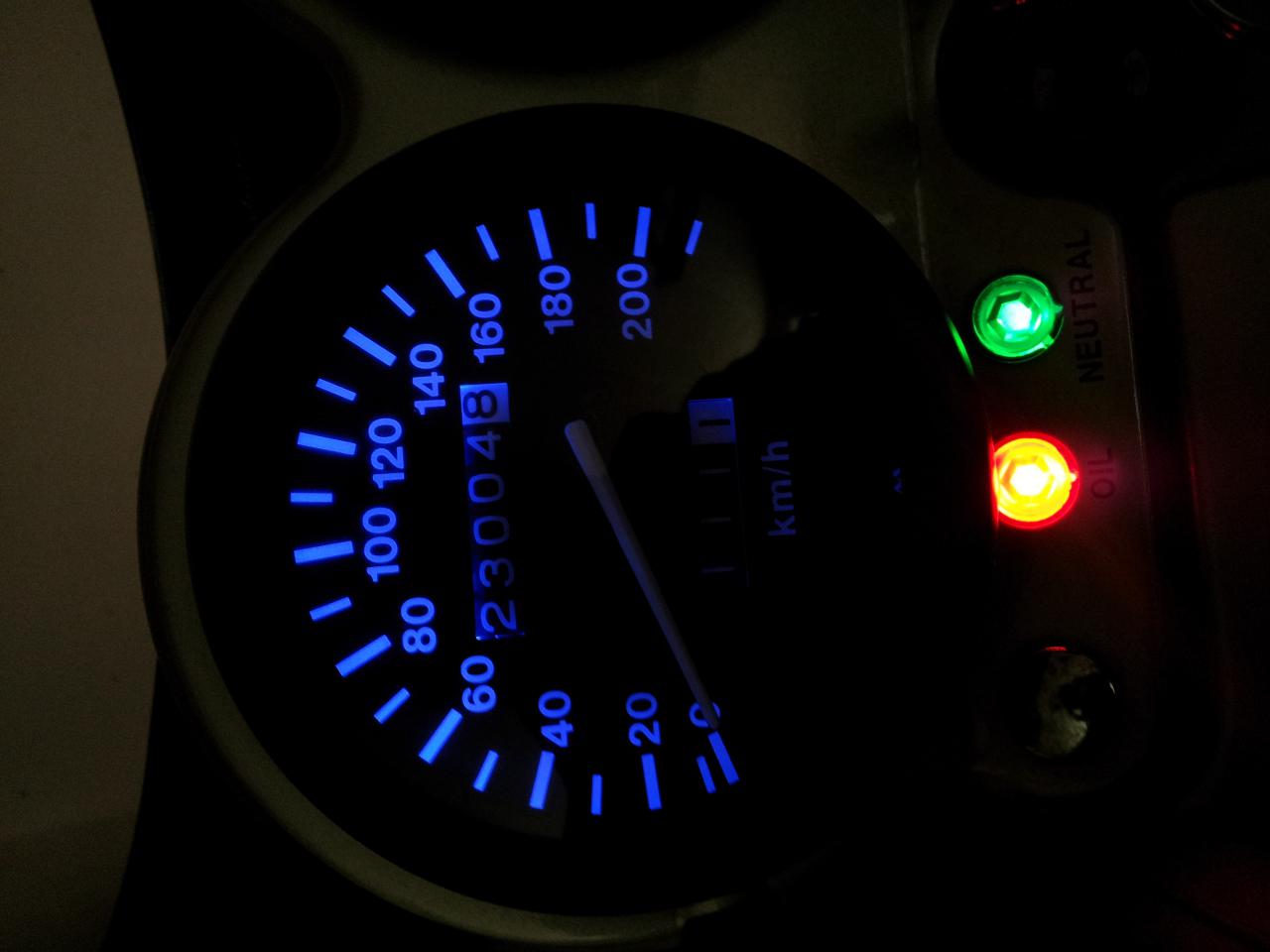 Die LED Gehäuse gabs bei Segor Elektronik für 3€ das Stück; nicht billig, aber dafür wasserfest und mit sehr guter Lichtausbeute; die Anordnung der Lampen ist anders als bei Geko: linker Blinker, Öl, Neutral (mitte), Fernlicht, rechter Blinker; Neutral ist jetzt orange, sonst hätt ich 3 grüne Leuchten gehabt, wollt ich nicht