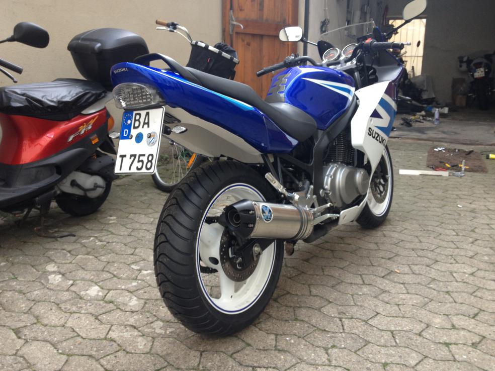 GS500F BJ06 mit erst 3000km und offener Leistung Veränderungen: SV650-Hinterrad-Umbau mit 160er, GSX Vorderrad mit 120er Telegabel mit Progessiven Wirth Federn GSXF Fender Balu Heckunterverkleidung mit Kennzeichenhalter Led-Blinker, Led Rücklicht und Led Tachobeleuchtung (blau) LSL Fußrasten u. Kettenschutz IXIL-Shorty ESD |