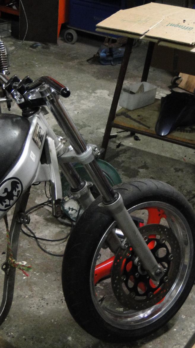 ..also, das Fahrwerk kann ich so verbauen wie oben beschrieben, allerdings werde ich die originale GSF400 Doppelremsanlage vorne verwenden mit 290mm Scheiben und vierkolben, statt einseitig sechskolben mit 310 Scheibe-der Sechskolbensattel passt bei der 400er Gabel nur mit 290er Scheibe, das ist mir dann zu wenig Negativbeschleunigung...42er Kettenrad geht auch durch und den Auspuff und die Fußrasten darf ich auch verlegen....