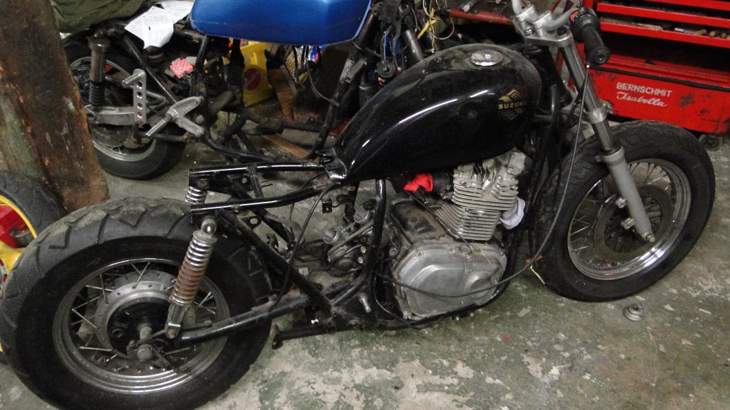 ...okay...kurz zu mir...bin Jörn, 40 Jahre alt, Industriemechaniker und schraube mit Unterbrechungen seit 20 Jahren an Motorrädern und Autos......nach langer Abstinenz habe ich mir vor drei Jahren eine GS450L gekauft-die bisherigen Umbauergebnisse mit GR 650 Motor seht ihr auf den Bildern....Ich lese die CUSTOMBIKE, wo Jims GS500E Umbau zu sehen war-irgendwie hat es mich dazu bewogen, in der Bucht eine GS500E für 200 Taler zu ergattern, weil sie günstig war und ich eine Mopete für die nächste Saison wollte....zu Hause angekommen, habe ich in meiner Teilesammlung VX800 und GSF400, bzw eine GS500 Brücke-alle mit pressbarem Joch und eine 1100er Gixxer Hinterradfelge (5,5+180er ) gefunden...eine 1200er Bandit Schwinge, eine GSF400 Gabel und die Sitzbank kamen dann auch noch aus der Bucht....wie man das Fahrwerk umbaut steht im Netz-allerdings verwende ich eine 16er Steckachse(Rahmen aufgebohrt) und die Bandit T-Buchsen(Buchsen eingeklebt und auf 16H7 aufgerieben) Federbein, Streben und Dämpfer sind noch Original-kann alles so zusammen gesteckt werden-optimiert wird nach dem Motoreinbau....Für die Felge brauche ich noch die Distanzen und den Kettensatz-(Kettenräder mit 520er Teilung und Passendem Lochkreis für den großen Träger passen von der ersten DR750, DR500, oder GN400) der genaue Versatz wird noch ermittelt....