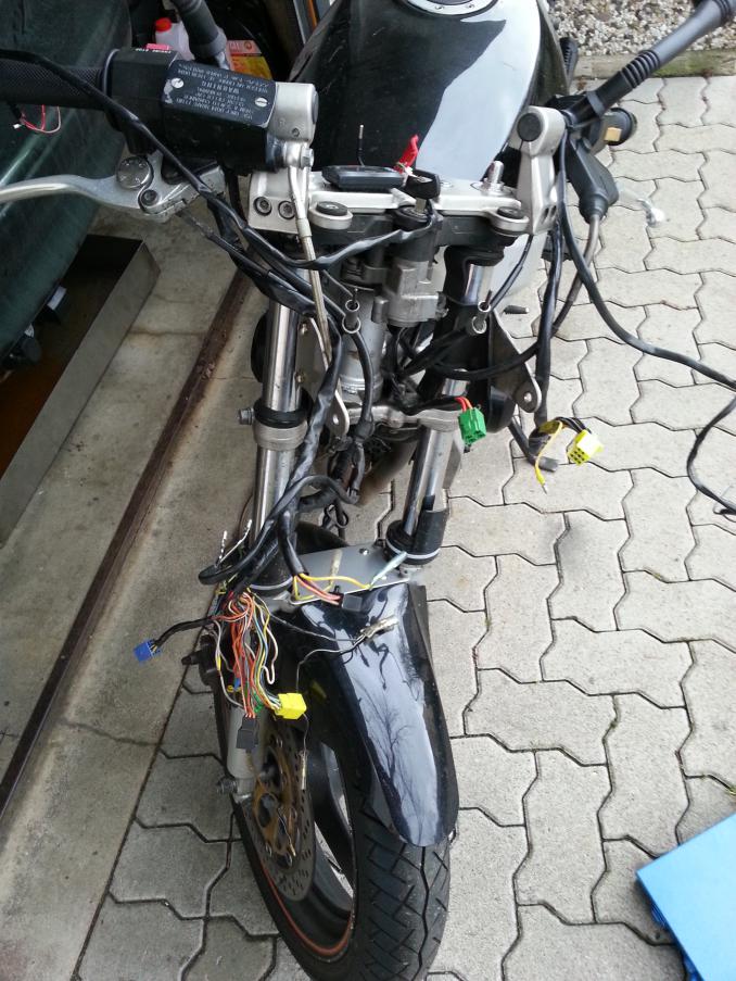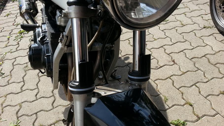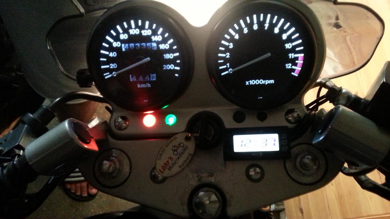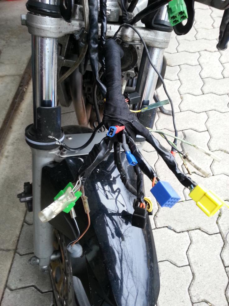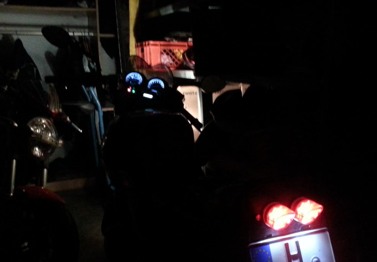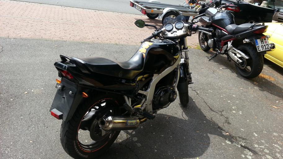ich dachte mir mal, ich werde hier ein wenig festhalten, was sich bei meiner kleinen '94er GS diesen Winter so alles verändert. Mal ganz von vorne. Gekauft habe ich "Die Dünne Berta" (Insider 800€, 48.331km, Zustand solala - ABER läuft... läuft gut Beim Kauf war schon einiges gemacht. - Nexxus(?) Komplettanlage (Krümmer+ESD) - getönte Puig-Scheibe - sehr sehr mäßig in Schwarz lackiert (viele Kratzer und 2 Dellen und Felgen auch sehr sehr sehr mäßig lackiert) - "GS500E"-Alu-Kettenschutz - Led-Rückleuchte - Tieferlegung - SV650 Klarglas-Scheinwerfer - Orangenes Tankpad+Felgenrandaufkleber - Spiegelblinker vorne / Blinker am Scheinwerfer entfernt - Miniblinker hinten Alles in allem garkeine soo schlechte Optik, aber alles halt relativ anfängermäßig gemacht... Ich habe bis jetzt schon die Tieferlegung entfernt und Gabelprotektoren, ein Multifunktions-Instrument von Koso (Boardspannung, Außentemperatur und Uhrzeit), Led-Cockpitbeleuchtung (Weiß) und einen Satz neue Reifen (Bridgestone BT45 v+h) nachgerüstet. Außerdem habe ich bis jetzt schon die Tachobrille wieder instandgesetzt (war an einer Stelle verbogen und insgesamt verrostet etc.) und den Rahmen teillackiert (Rostige Stellen). Ein allgemeiner Service war natürlich auch schon mit drin. Ölwechsel mit Filter, Bremsflüssigkeit, Luftfilter und Zündkerzen kamen neu Bilder: Nun habe ich mir vorgenommen, noch bis zum Start der Saison 2015 alles ein wenig aufzufrischen. Ich habe vor: - Alles einheitlich Schwarz(leicht Metallic)-Hochglanz lackieren (Tank, Heck, Soziusgriff und Schutzblech vorne und Felgen) - Rote Felgenrandaufkleber und neues Tankpad (Schwarz-Rot) - Andere Griffe (Schwarz) (danke dafür schonmal an Russedeluxe - Rücklicht wieder Original machen - Scheinwerfer erneuern (Steinschlag) - ENDLICH die blaue Fernlichtkontrollleuchte einbauen - Cockpitbrille nochmal neu Lackieren (Farbe weiß ich noch nicht, Wahrscheinlich wieder silber) - eventuell Sitzbank beziehen lassen - Dellen aus dem Tank entfernen (Umfaller vom Vorbesitzer -.-) - Motorreinigung (Dichtung am Steuerkettenspanner undicht) - Sommerfit machen (Luftdruck, Kette schmieren, Licht einstellen, etc. pp Last but not Least natürlich nochmal Polieren und dann schöne Fotos machen Schritt 1: Rückleuchte Umbauen Kurz und knackig. Ich habe mir in der Bucht für 15 euro ein Originales Rücklicht bestellt und das gute Stück dann Zuhause erstmal zerlegt (leider hab ich dabei noch keine Fotos gemacht). Als ich das "Glas" abhatte ist mir aufgefallen, dass die Reflektionsfläche schon mattgrau und rissig ist... Also kurzerhand (wie auch schon bei meinen Spiegelblinkern) Alufolie zerknittert und mit der glänzenden Seite nach oben draufgeklebt (Reflektion gleich viel besser und hält mit Pritstift super! Natürlich auch direkt umgebaut am Moped Bilder: \l/ Update! \l/ Schritt 2: Kabelbaum Flicken/Aufhübschen Teil1 (Lampen-Kabelbaum) Beim Ausbau des Scheinwerfers ist mir aufgefallen, dass der Kabelbaum relativ zerpflückt ist und teilweise pfuschig geflickt wurde. Also kurzerhand Iso-Tape und Gewebeband besorgt, die gepfuschten Stellen vernünftig mit Quetschverbindern geflick und alles Tutti eingewickelt. Außerdem hatte ich meinen Bordcomputer nur mit 2 Stromdieben angeknipst - das ganze habe ich jetzt auch trennbar mit Steckern gelöst. Der nächste Schritt wird sein, dass ich die "neue, gebrauchte" Cockpitbrille mit der blauen Kontrollleuchte ( ) lackmäßig auffrische und komplettiere, die Dellen aus dem Tank mache (wahrscheinlich eingebaut mit der Druckluft-Methode) und danach die Verkleidungen sowie den Tank lackiere (Lack ist schon da Danke schonmal fürs Lesen Die Linke zum Gruß, euer Nestea