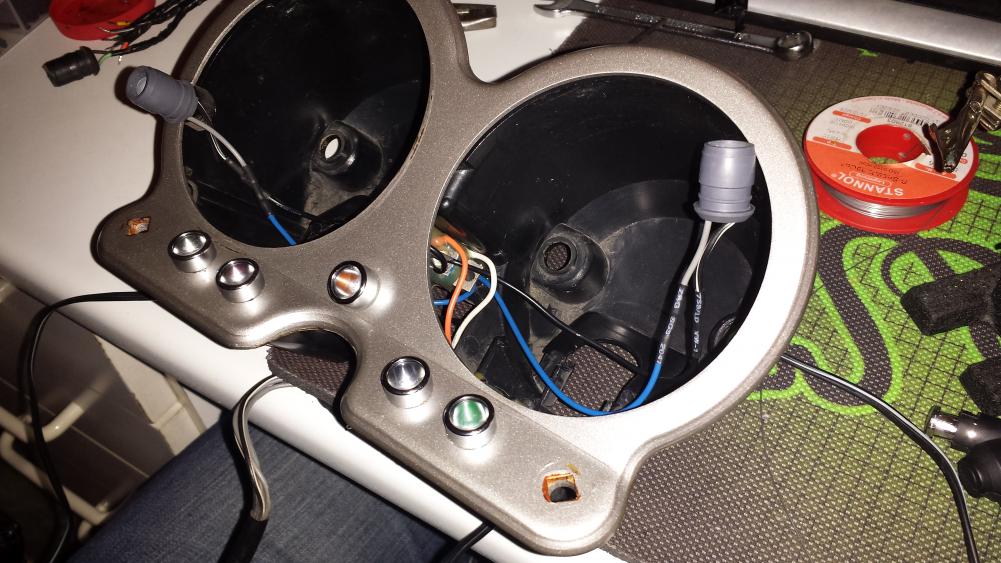 Kurzfassung: Hab die ganzen Leuchten jetzt komplett auf LED umgebaut, also quasi wie es geko gemacht hat: Klick mich Bilder zum Umbau: Die LED Gehäuse gabs bei Segor Elektronik für 3€ das Stück; nicht billig, aber dafür wasserfest und mit sehr guter Lichtausbeute; die Anordnung der Lampen ist anders als bei Geko: linker Blinker, Öl, Neutral (mitte), Fernlicht, rechter Blinker; Neutral ist jetzt orange, sonst hätt ich 3 grüne Leuchten gehabt, wollt ich nicht Bild 3 zeigt eines der Y-Stücke, wovon der Kabelschuh zur Blinkerkontrolleuchte geht und der runde Japanstecker zur Versorgungsletung (beides im Lampengehäuse; ist dann auf Bild 5 nochmal gut zu sehen): Fertig verlötet und verschrumpft kommt das Ganze dann ins Lampengehäuse: Blinkertest (Dauerlicht): Einziger Nachteil an der ganzen Sache ist jetzt nur, dass ich leider keine Stromregelung eingebaut habe...dementsprechend sind die LEDs durch Spannungsspitzen nur durch die Widerstände geschützt... Hätte ich jetzt aber für jede LED noch zusätzlich nen Festspannungsregler verbaut, wäre das alles nochmals aufwändiger geworden; ich wollte es aber endlich fertig haben... Falls jetzt also eine LED den Geist aufgeben sollte, muss ich halt nochmal die Blende abmontieren und ne neue LED reinsetzen...erstmal sollte es aber gehen. |
