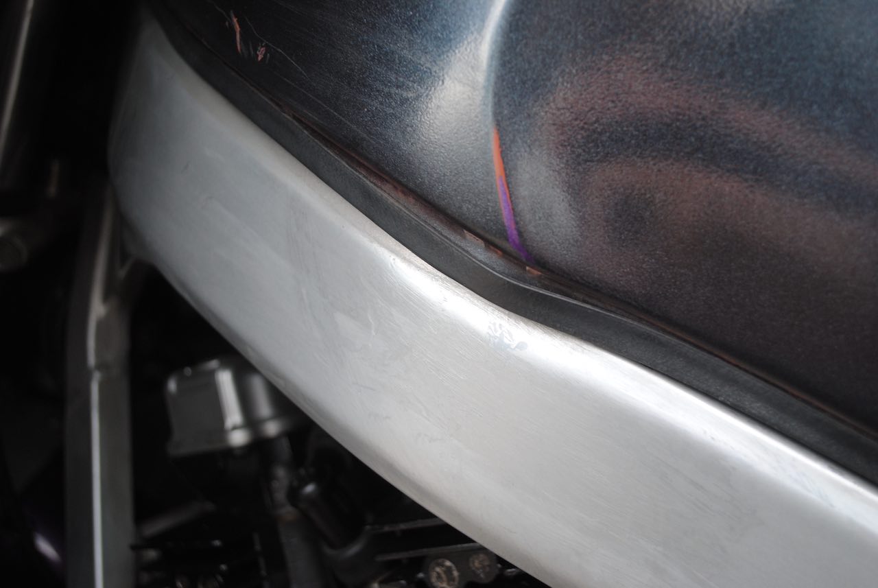 Den Tank und die Seitenverkleidung hat mein direkter Vorbesitzer schwarz lackiert - obwohl ich das abgelehnt hatte. Er war jung und brauchte das Geld. Dafür hatte er aber auch den Takkoni-Auspuff anbauen lassen.