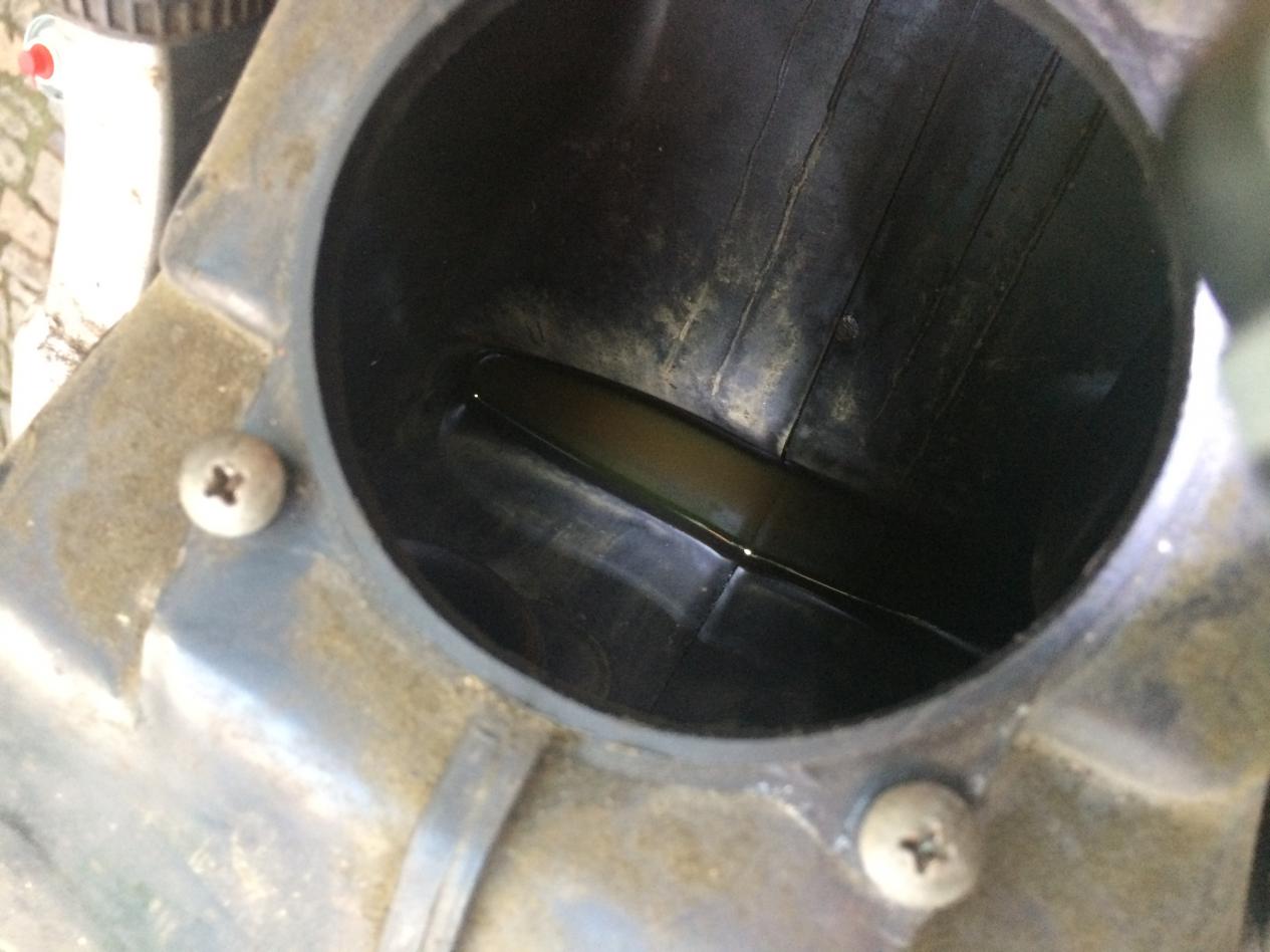 Weiter gehts. Ölpegel weit über dem normalen Füllstand, Öl riecht nach Benzin. Das schon mal nicht gut. Das erste Mal den Ablauf vom Luftfilterkasten in der Hand. Was sich der Vorbesitzer dabei gedacht hat...keine Ahnung. Erster Blick auf den Vergaser und Gas-Bowdenzug.