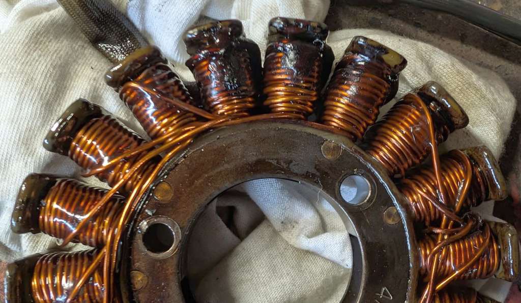 Die Lima ist rasch ausgebaut (Mopped zur Seite neigen, damit kein Öl rausrinnt) und Deckel runter. Wenn es was hat, sieht man es meist sofort an den Spulenverfärbungen.