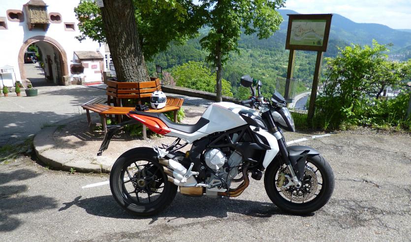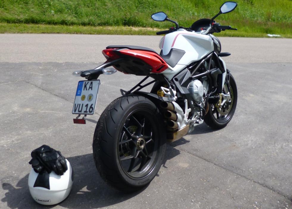 das Möp hab ich bei März in Ettlingen für 20€ "Kurzzeit-gemietet" - maximal 2 Stunden ( das hat gereicht um meine Hausstrecke zu erreichen und rechtzeitig wieder zurück zu sein ) ich wollte zwar zuerst die 675er leihen hab aber dann die 800er bekommen die Passform war für mich sehr gut , sowohl von der Sitzhöhe als auch von der Entferung zur Lenkstange Die Traktionskontrolle stand die ganze Zeit auf Stufe 6 ( von 8 ) und arbeitete absolut zuverlässig ( wenn man ohne Vollkasko Versicherung unterwegs ist , freut man sich über solche Gimmicks ) Es gibt ein 4stufiges Mapping für die Motorcharakteristik Sport-Normal-Rain-und ein individuell programierbares im Sportmodus ist die Kiste schon recht giftig und mir fiel vorallem unangenehm auf , dass das Gas spürbar länger stehen blieb als meine Handstellung dies vorgab , das macht auf der Rennstrecke vermutlich sogar Sinn , wenn man in voller Schräglage beim Gaswegnehmen nicht abruppt die Wirkung der Motorbremse zu spüren bekommt , aber im Strassenverkehr sorgt es hin und wieder für Schreckmomente , wenn sich das "Spätbremsen" dadurch nochmals deutlich verzögert in der Normal Einstellung war diese Effekt dann nicht mehr zu spüren und zudem kam mir als Vergaserfahrer das minimal verzögerte Ansprechen bei der Gasannahme sowieso etwas entgegen ( ist halt alles Gewohnheitssache ) im Rainmodus erinnerte sie mich dann fast schon wieder etwas an meine Gs Die Leistungsentfaltung des Dreizylinders ist sehr speziell und am ehesten mit den alten Zweitaktern vom Schlage einer RD 350 "Hebdichfest" zu vergleichen - jedoch mit dreimal soviel an Leistung die Maschine läuft erst ab 4000 wirklich geschmeidig ist aber bereits ab 2000 ruckelfrei fahrbar zwischen 4 und 6000 lässt sie sich sehr entspannt aber auch eher unspektakulär fahren über 6000 geht sie "richtig gut" , doch bei knapp unter 8000 schiebt sie dann plötzlich so ungestüm und kompromisslos nach vorn , dass es schwer ist eine entspannte Körperhaltung bei- und das Vorderrad unten zubehalten in diesem Bereich verdient sie ihren Namen "Brutale" wirklich und nach diesem Kick könnte man wirklich süchtig werden die Bremsen sind tadellos , Kupplung und Schaltung waren präzise und leichtgängig der Schalthebel hat zwar einen etwas langen Hebelweg was ich allerdings nicht als störend empfand , und das Schalten ohne Kupplung ( wie ich das auch bei der Gs praktiziere ) lief spielerisch der kurze Radstand und die Enduro ähnliche Sitzposition mit der Segelstange waren anfangs etwas gewöhnnungsbedürftig begannen aber zum Ende der Mietzeit immer mehr Spaß zu machen mit einer Einschränkung - denn auf der Bahn wünscht man sich bereits bei 150 einen wirkungsvollen Windschutz und bei Tacho 220 verschwamm mir dann die komplette Aussicht vor den Augen aufgrund der heftigen Helmvibrationen durch den Fahrtwind das Motorrad ist keinesfalls als bequem zu bezeichnen - und die harte sehr schmale Sitzbank ist sicher nichts für Kilometerfresser - die MV hat aber dafür einen ganz eigenen Charme , und den mag man eben oder nicht wer etwas gnadenlos unvernünftiges sucht ( weil er z.B schon ein Vernunftmoped in der Garage stehen hat ) dem kann ich nur wärmstens empfehlen sich die Brutale einmal näher anzuschauen