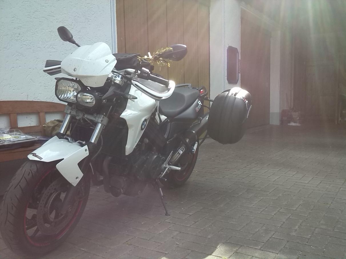 Die F mit 'nem Givi-Quicklock-Kofferträger ausgerüstet, eine Gepäckbrücke besorgt und das Material, um das Alu-Rack von SW-Motech an die Brücke dranzubauen.