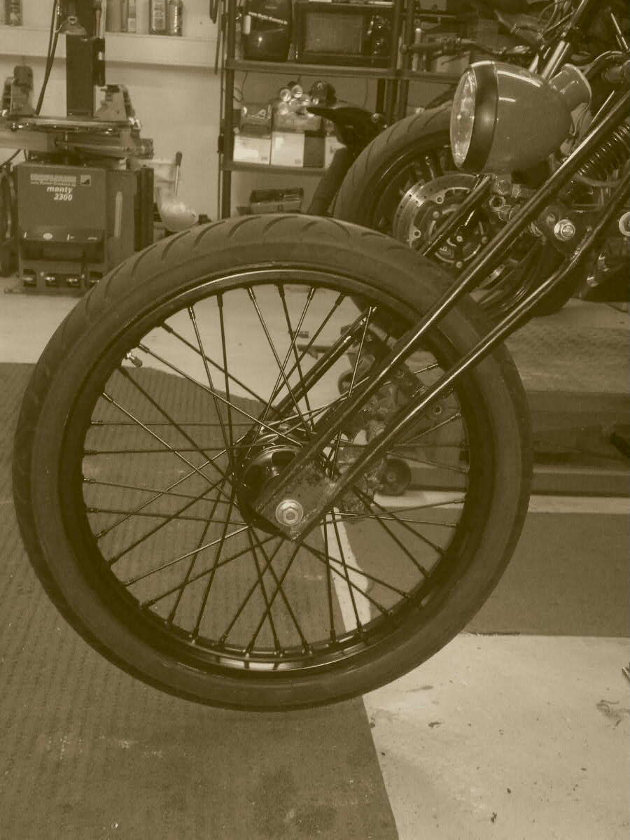 am Chopper ist ein Ende in Sicht, Vordere Felge eingepasst mit der Bremse. Nun noch schwarz pulvern, Reifen aufziehen und fertig.