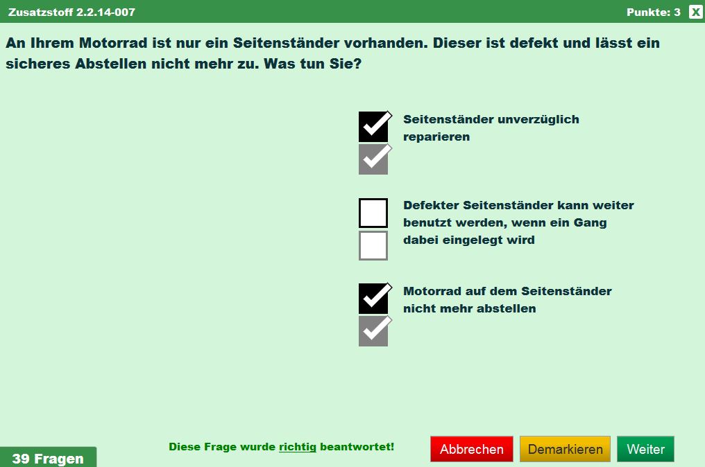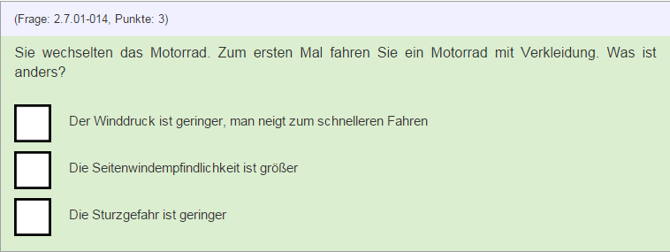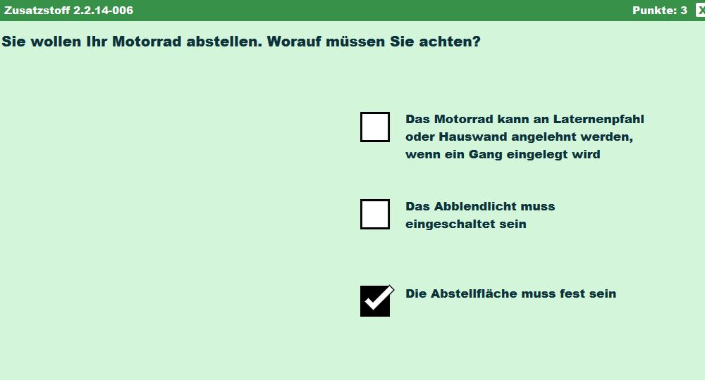 Da gibt es nichts zum Auswendiglernen, die Frage ist klar, die Antworten plausibel. Genau sowenig kann ich bei den Fragen zum Abstellen/Seitenständer etwas lustiges finden, außer vielleicht dass sie so einfach sind und jemand ein Problem damit hat...